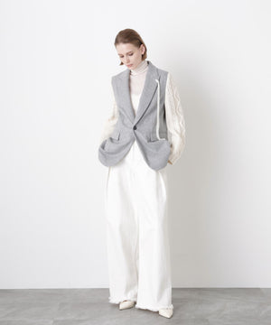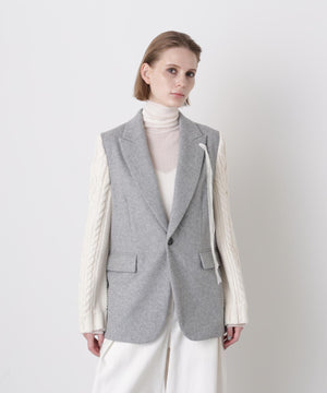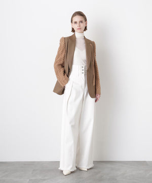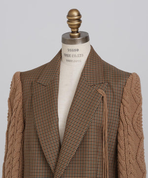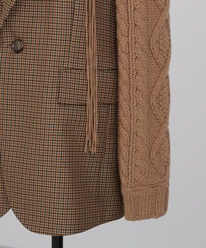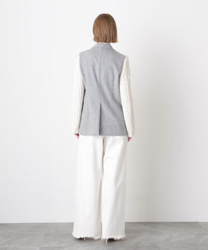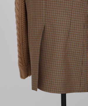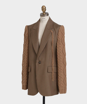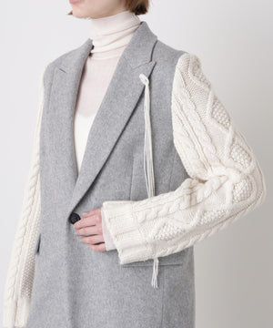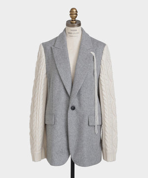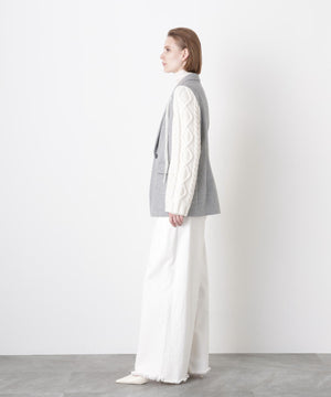 異素材の魅力を際立たせたテーラードジャケット。シックなワンボタンボディにやや広めのピークドラペルを配し、クラシックな雰囲気を添えています。袖は3ゲージのアラン柄ニットで編まれたボリューム感のあるデザインをドッキング。柔らかなニットの質感とジャケットのきちんと感が絶妙に融合し、上品さとリラックス感を兼ね備えた一着に仕上げました。日常のスタイルにモードなアクセントを加えつつ、オーセンティックで洗練された印象を演出します。