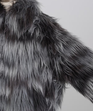 独特の存在感が魅力のファージャケット。オリジナルのカーリーヘアーフェイクファーは、基布をカモフラージュ柄のジャカードで表現し、1つの柄に4色のファーを組み合わせて生まれる独特のミックス感が特徴です。短めの着丈と太めの袖、シャツタイプの大きな衿が印象的なデザインで、フロントは大きめの金属ファスナーを採用。グログランテープの玉縁始末により、ファーの噛み込みを防ぎつつ、着こなしにモード感とリラクシーなニュアンスをプラス。個性的ながら上品さを備えた一着です。