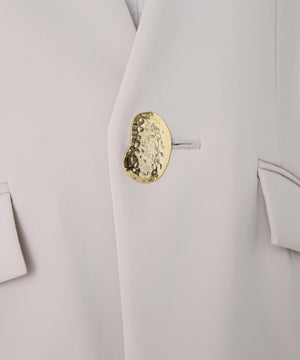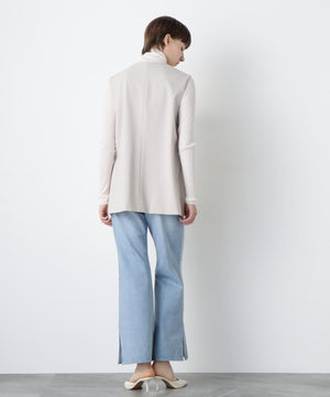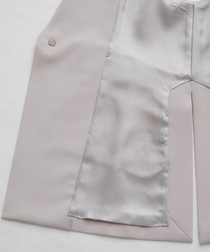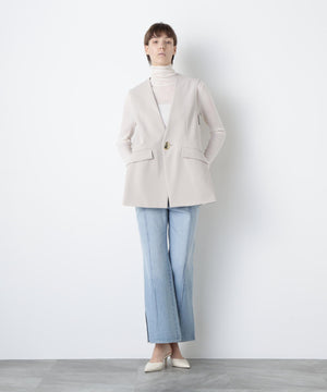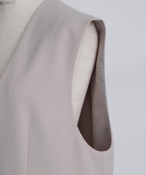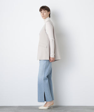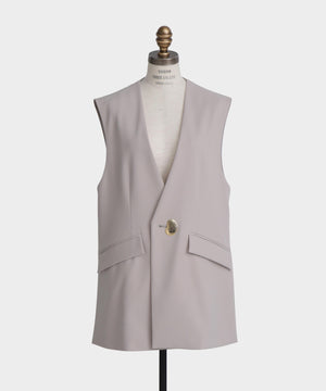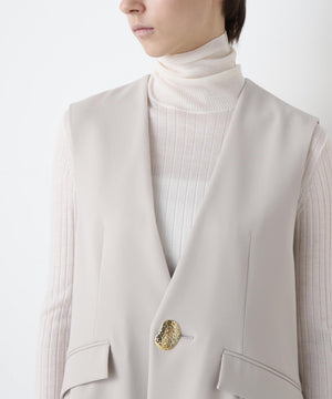 美しい膨らみとしなやかなドレープを備えたストレッチ素材のジレ。発色の良いコンパクトな風合いの二重織素材が、洗練された印象を際立たせます。フロントには、職人の手仕事を思わせるビーンズ型のオリジナルメタルボタンを配し、華やかなアクセントに。ノーカラーのシャープな襟元と深めに入れた両サイドスリットが、全体をすっきりとクリーンにまとめています。同シリーズのパンツとのセットアップも可能です。