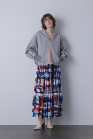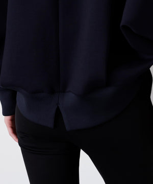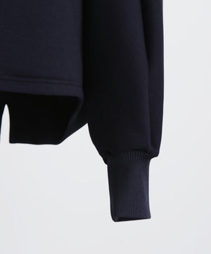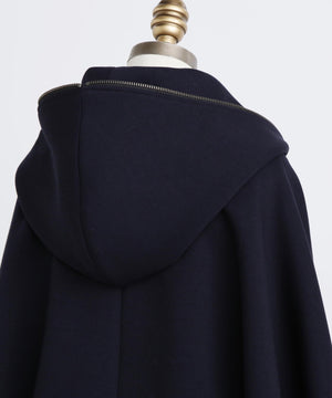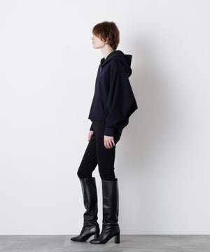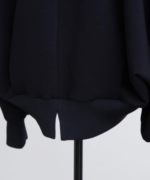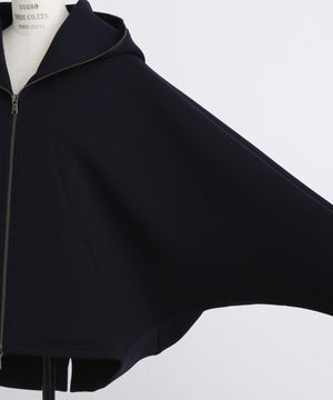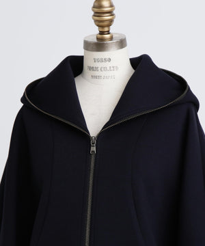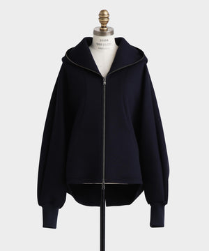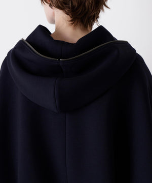 スウェットパーカーのようなカジュアルさに、カッティングや素材使いで洗練されたデザインポイントを詰め込んだ一着。フードの頂点まで届くメタルファスナーが全体の印象をシャープに引き締め、衿の返りに立体感をプラス。袖口には編み立てリブを配し、アウターとしての存在感を際立たせています。後ろ身頃にボリュームを持たせ、裾は後ろ下がりの特殊なパターン設計で、動きのあるシルエットを演出しました。
