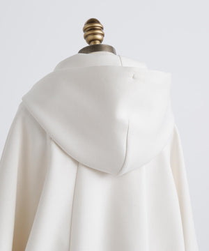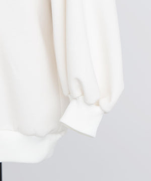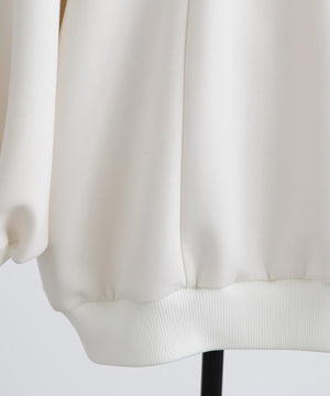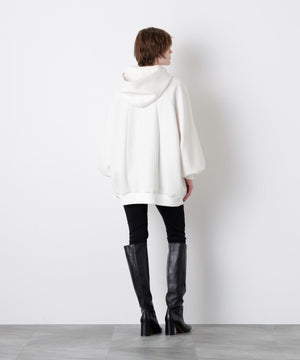 素材はスポンジを挟み込んだ様に嵩高で、かつ軽さが特徴のダンボール素材です。タップリとした身頃と長めの着丈にデザインすることでスポーツ感を削ぎ落としたフーディーになりました。フードには先を金属でチップ加工したアクリルの丸紐を通しアイレットと合わせてアクセントになっています。ラグラン線と並べた切替を利用し、すっきりとしたポケットをつけています。