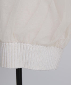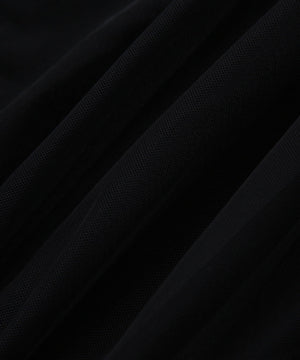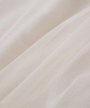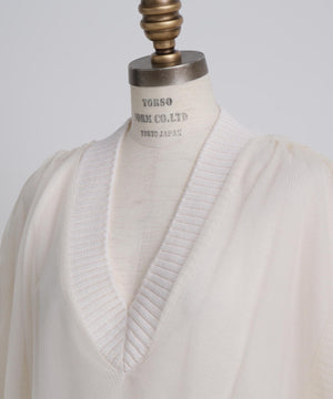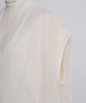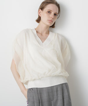 ウール100%の柔らかな糸で編んだVネックジレに、同系色の軽やかなポリエステルチュールを組み合わせました。まるで色がにじんだようにふんわりと広がるチュールが、ニットの周りに華やかな立体感を生み出します。身頃は14ゲージの片畦編み、リブは5ゲージの2×2リブで仕上げており、しなやかで上質な着心地を実現。単体でもレイヤードでも映える、洗練されたエレガントな一着です。