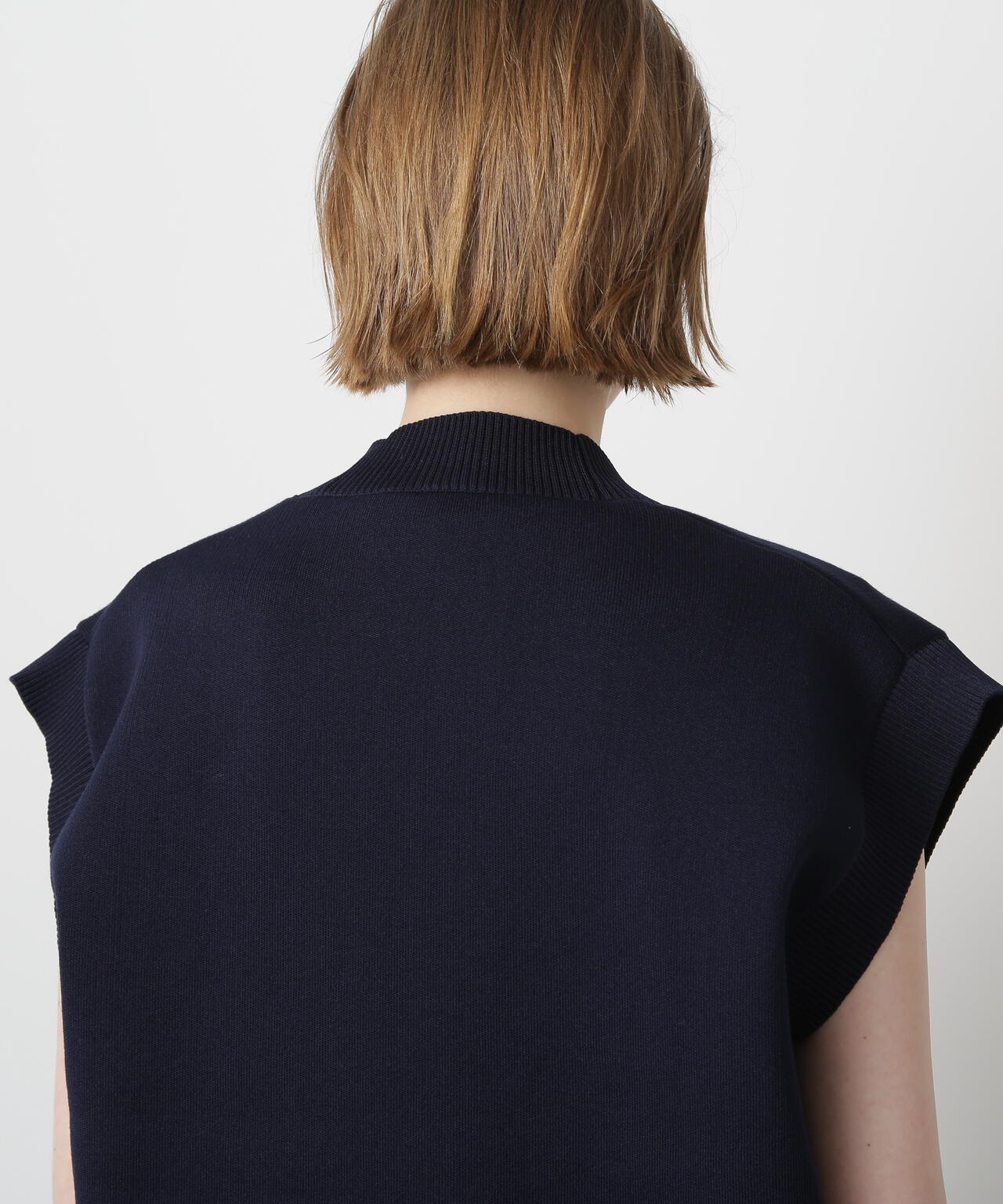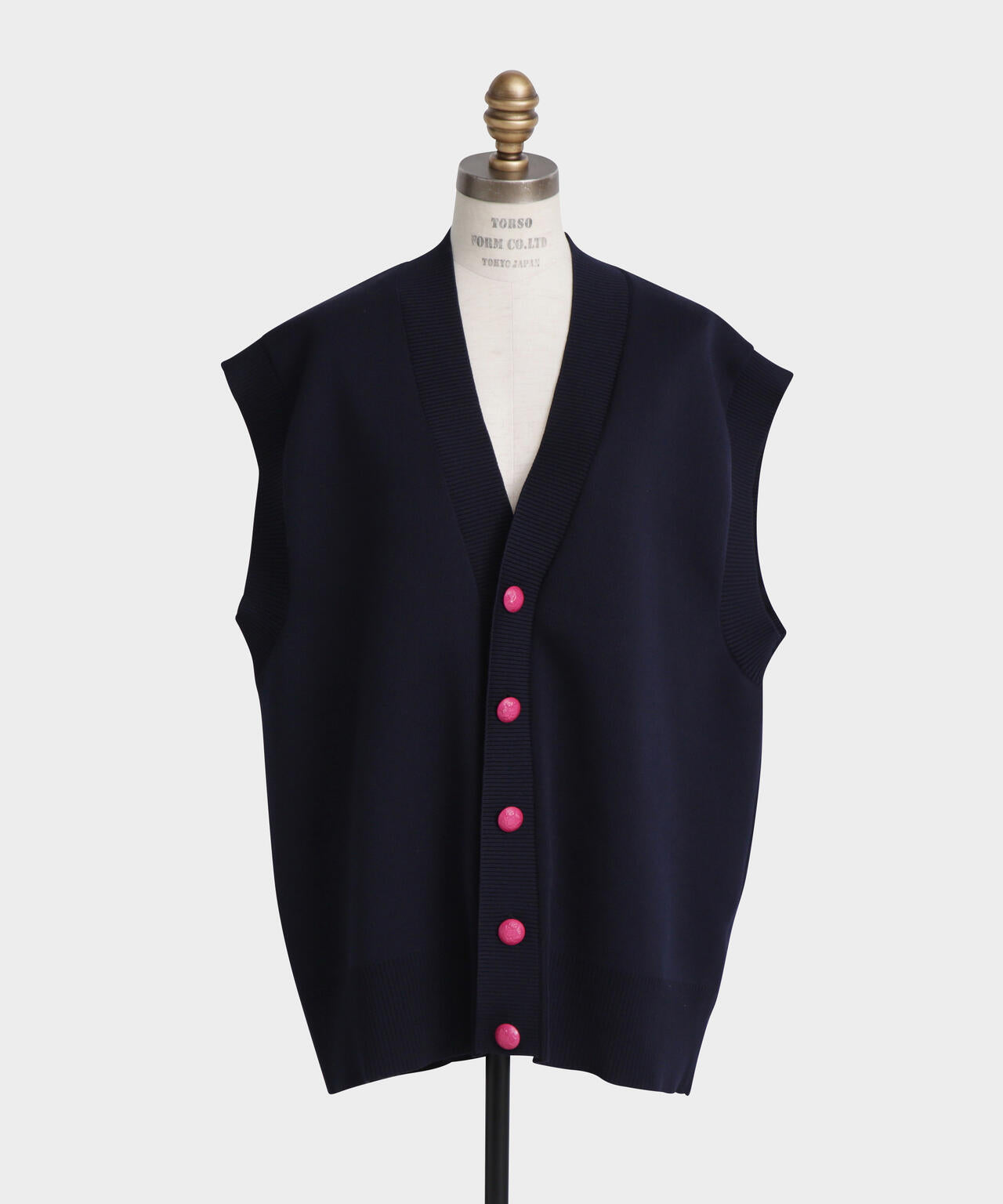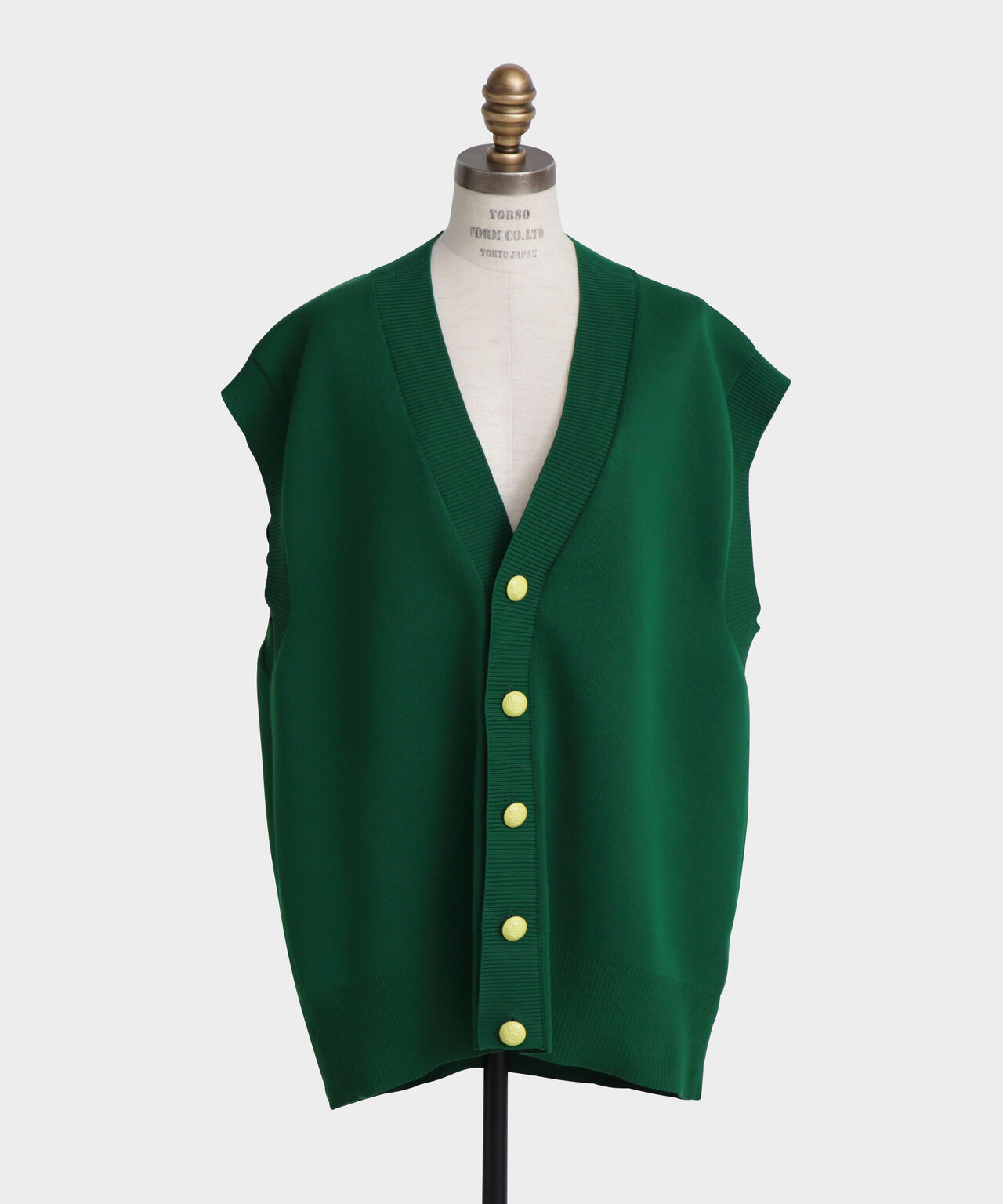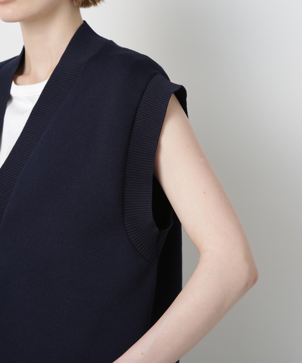 オーバーサイズの豊かな分量感と、シャープなラインが調和したモードなニットジレ。合繊複合糸を使用し、フルニードル編みで編み上げることで、ニット特有の柔らかさを抑えたモダンな佇まいに仕上げました。さらりとした質感はシーズンレスに活躍し、羽織るだけで都会的な印象に。フロントにはオリジナル塗装のメタルボタンをあしらい、さりげなくも印象的なモード感をプラス。日常に映える一着です。