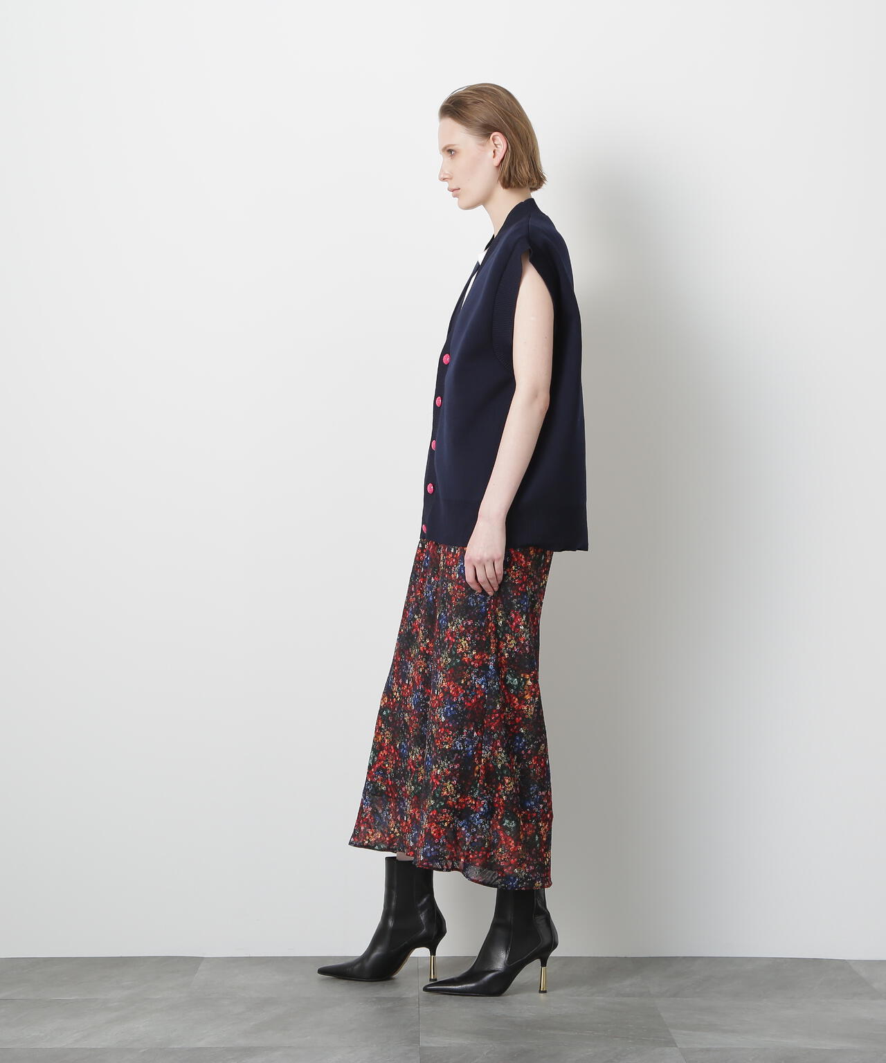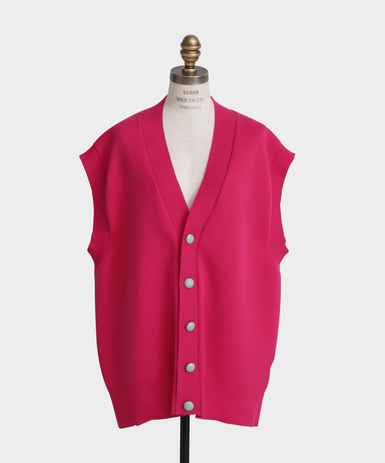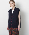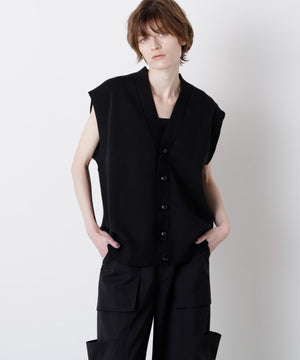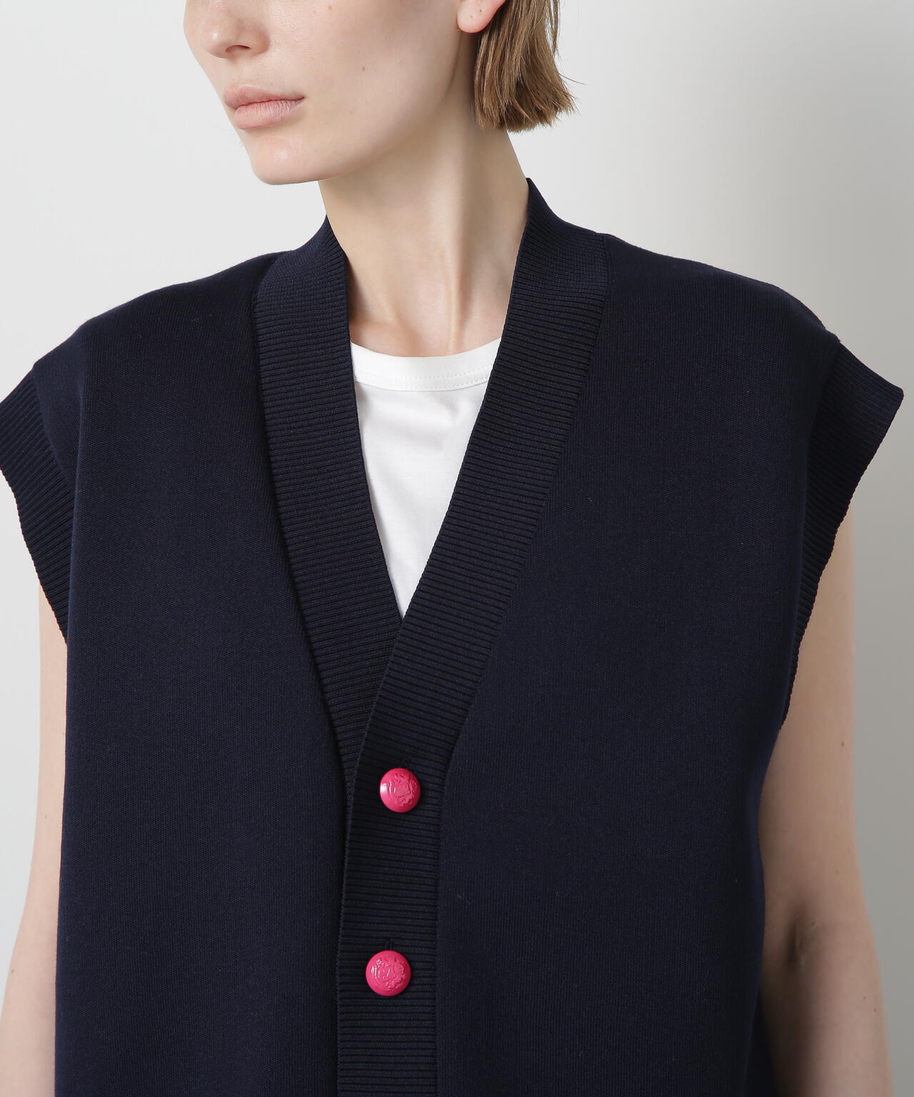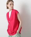 オーバーサイズの豊かな分量感と、シャープなラインが調和したモードなニットジレ。合繊複合糸を使用し、フルニードル編みで編み上げることで、ニット特有の柔らかさを抑えたモダンな佇まいに仕上げました。さらりとした質感はシーズンレスに活躍し、羽織るだけで都会的な印象に。フロントにはオリジナル塗装のメタルボタンをあしらい、さりげなくも印象的なモード感をプラス。日常に映える一着です。
