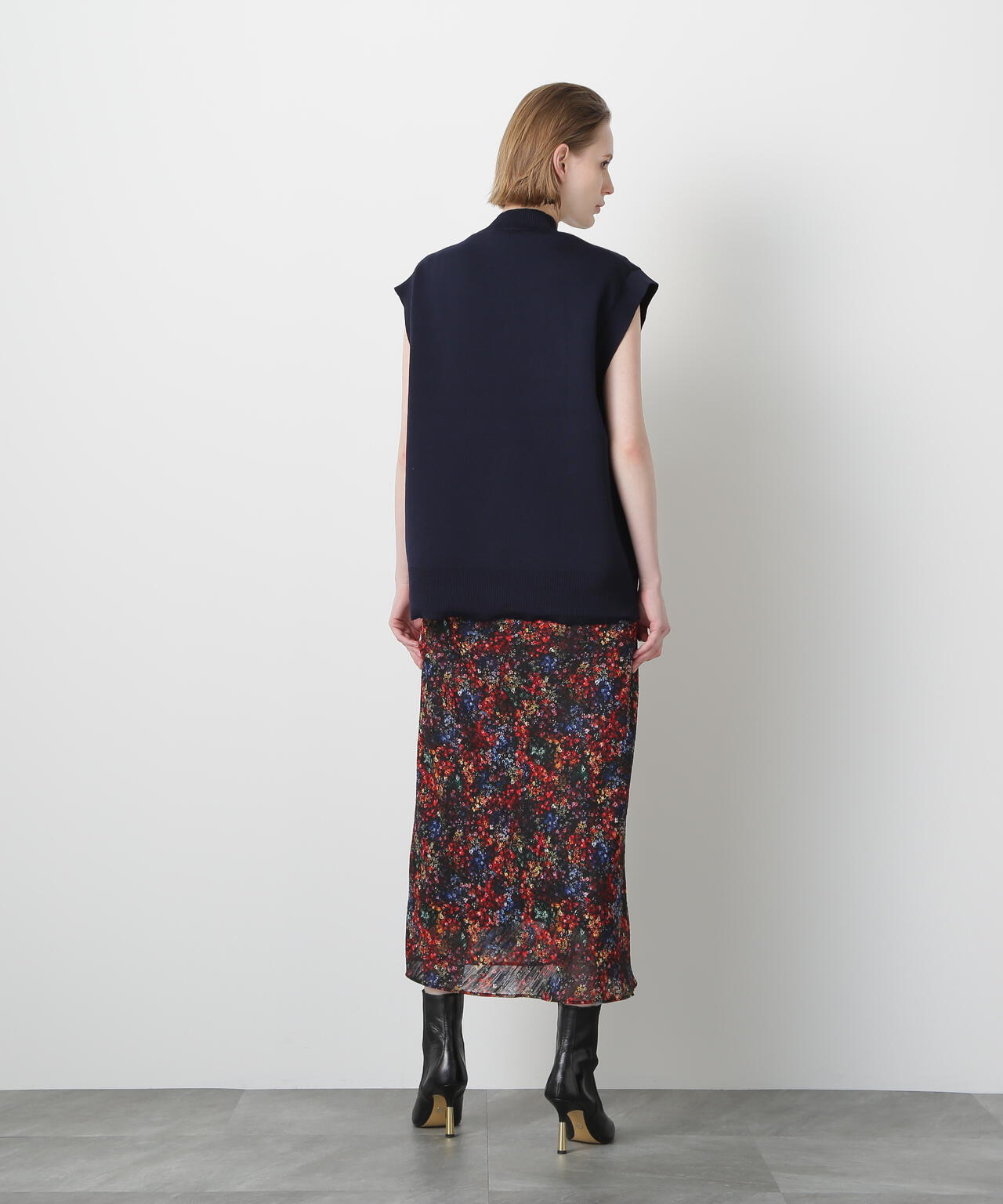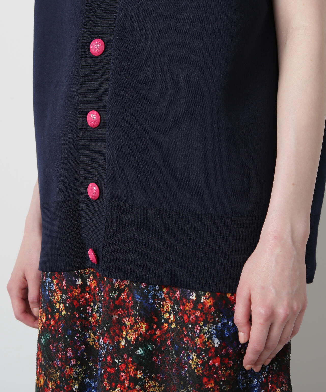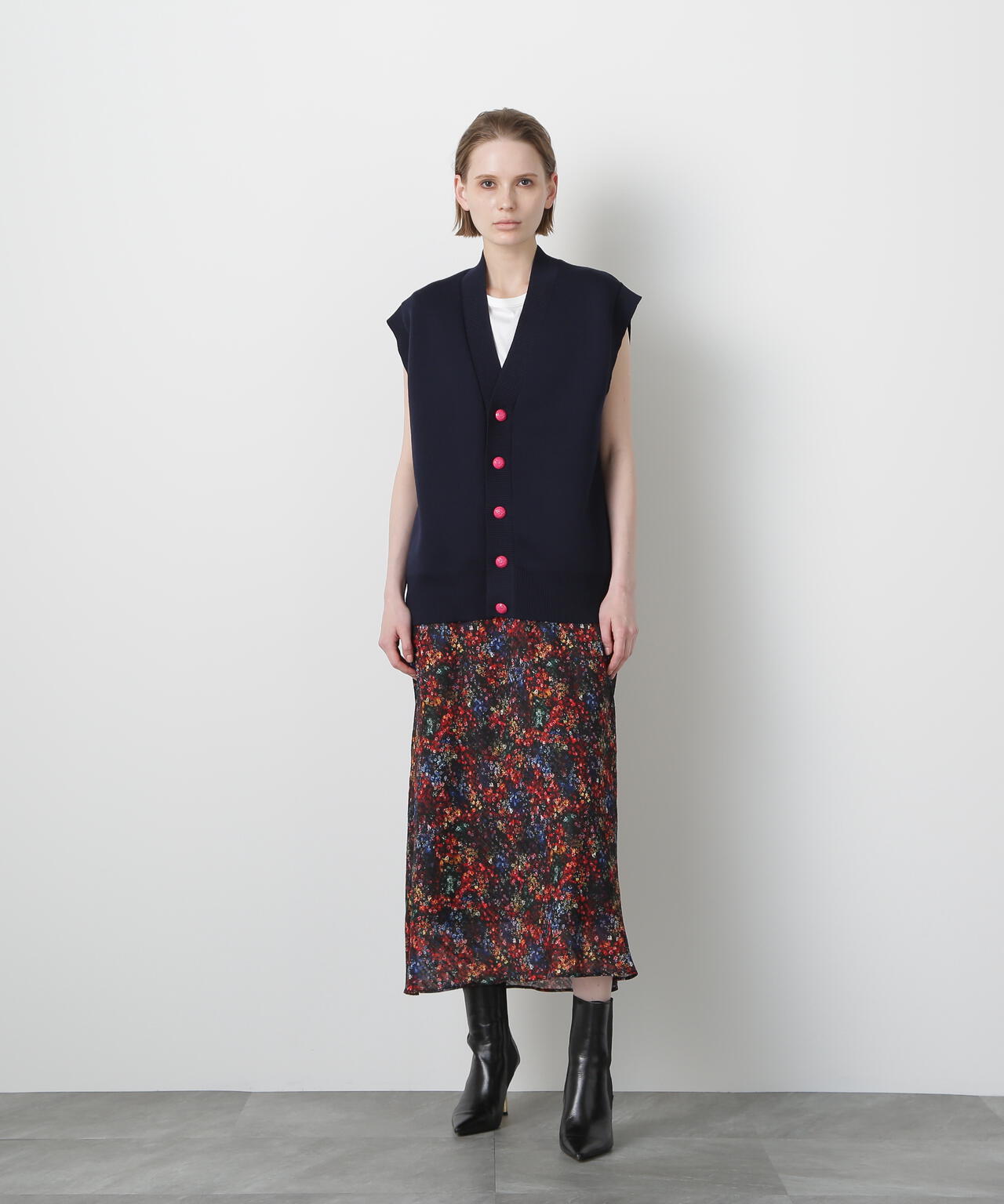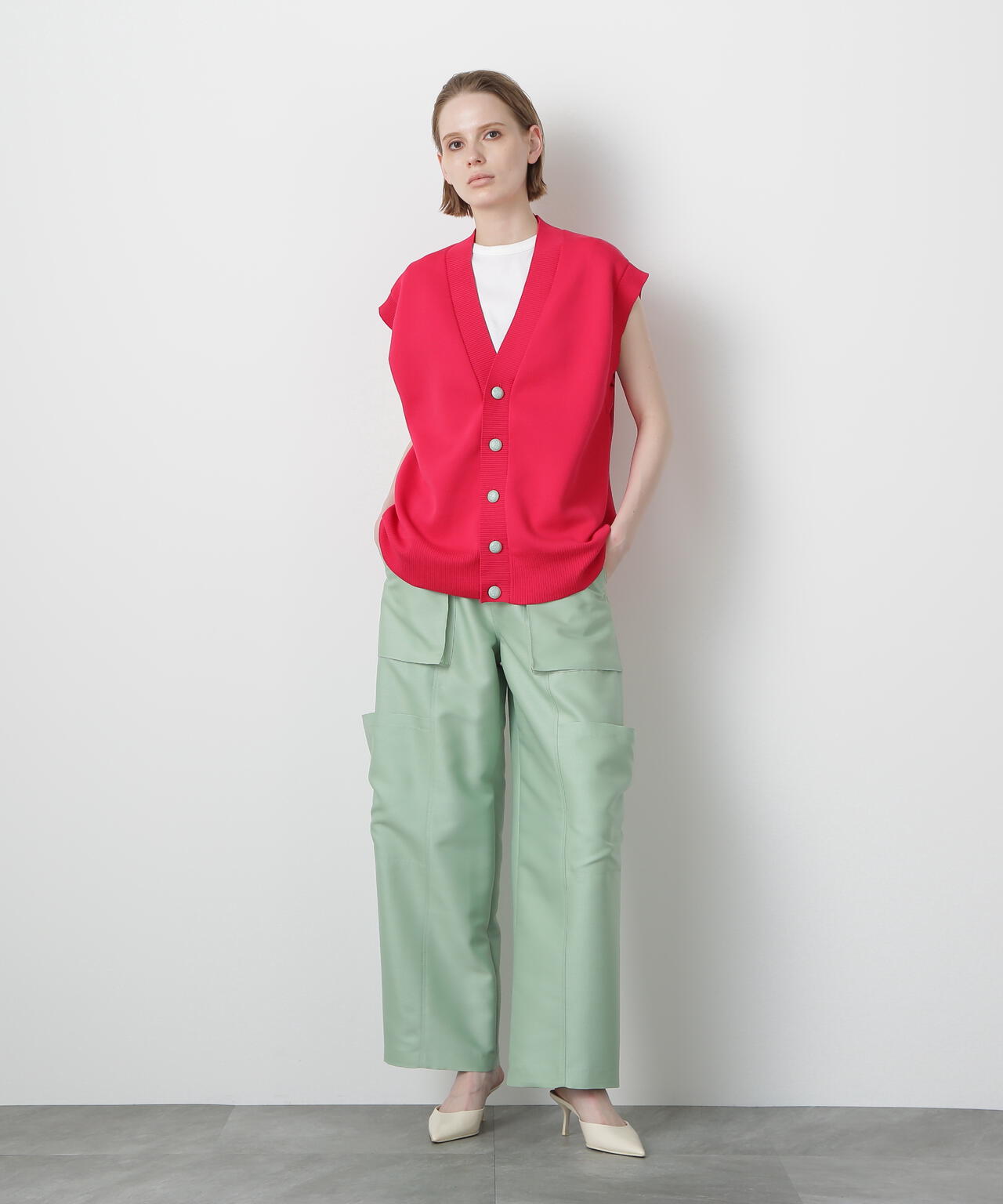オーバーサイズの豊かな分量感と、シャープなラインが調和したモードなニットジレ。合繊複合糸を使用し、フルニードル編みで編み上げることで、ニット特有の柔らかさを抑えたモダンな佇まいに仕上げました。さらりとした質感はシーズンレスに活躍し、羽織るだけで都会的な印象に。フロントにはオリジナル塗装のメタルボタンをあしらい、さりげなくも印象的なモード感をプラス。日常に映える一着です。