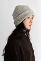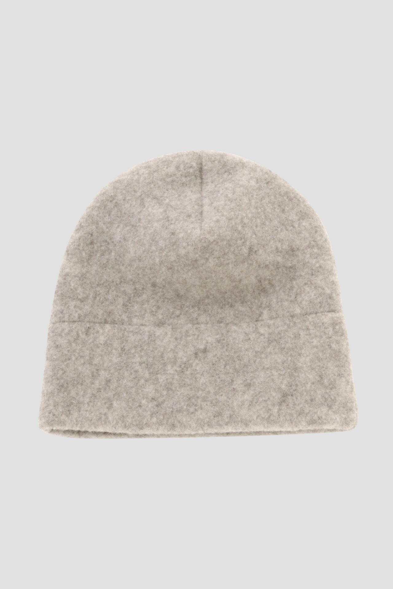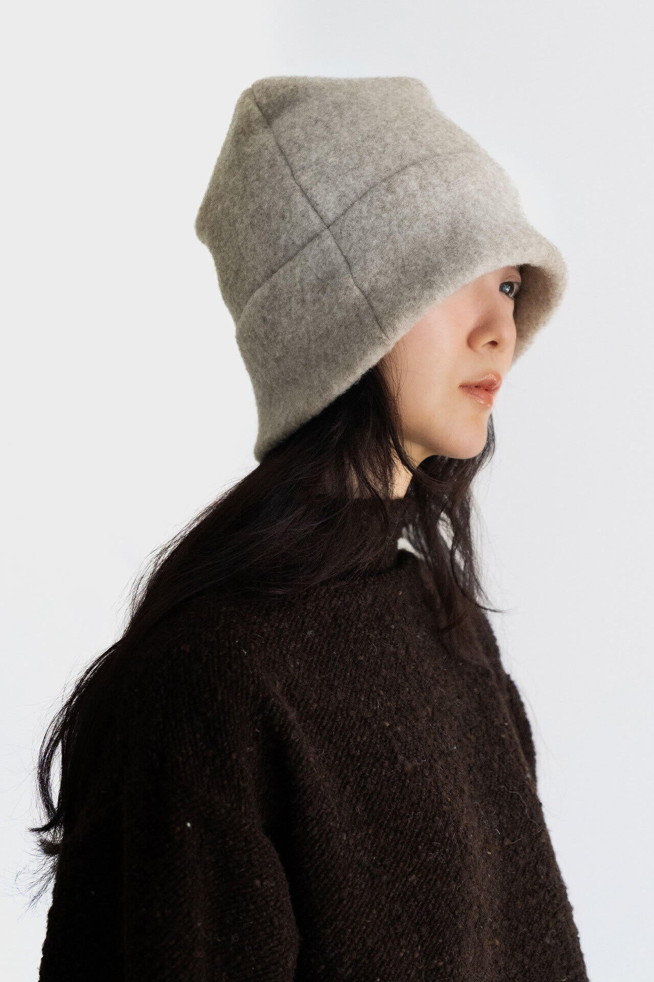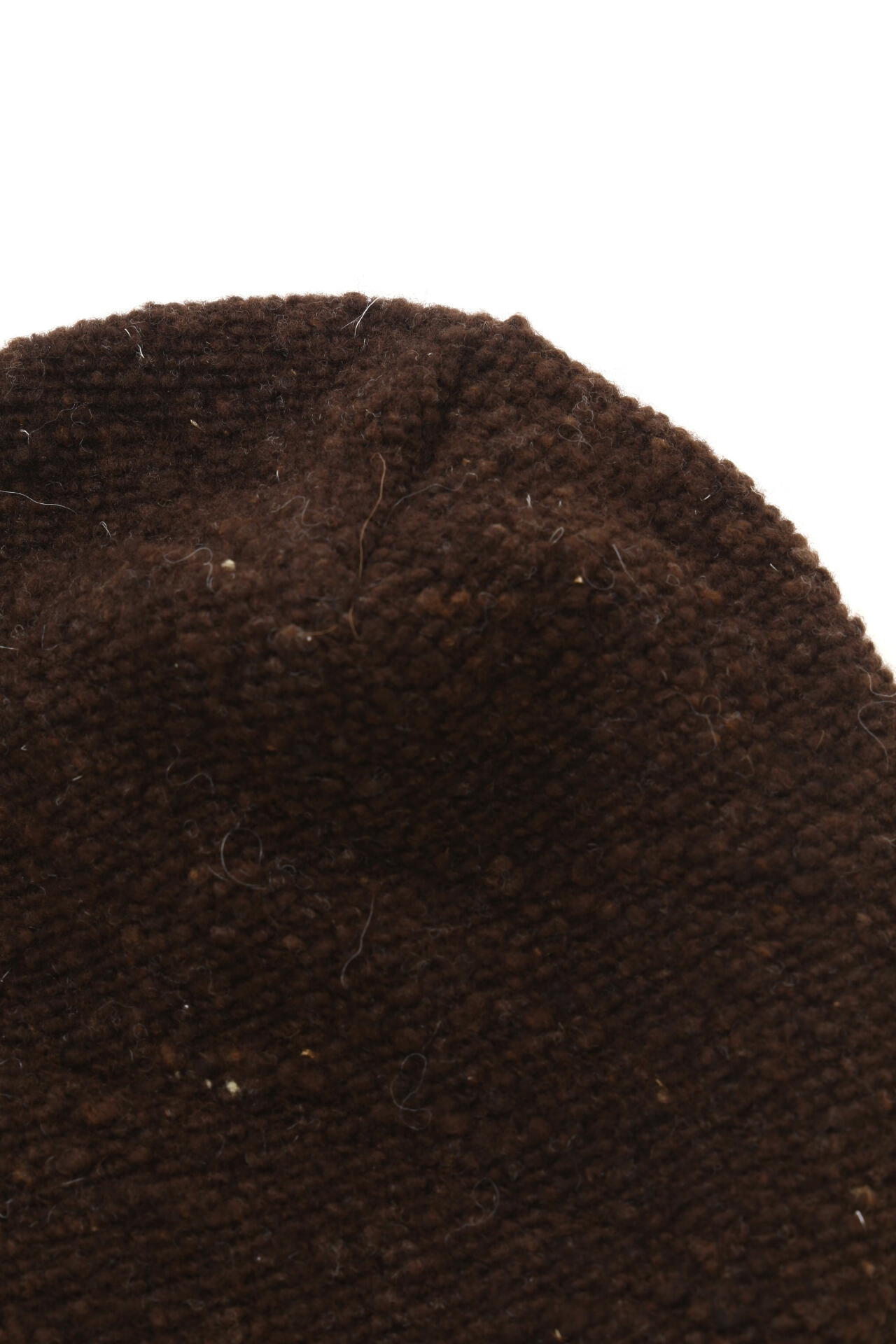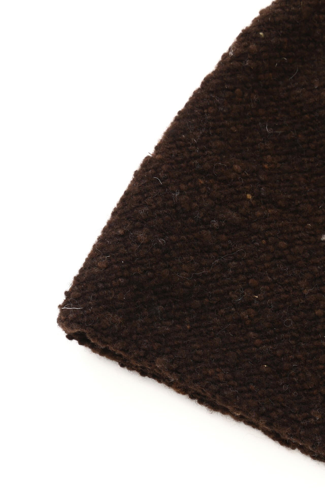 ウェイトのあるパイル地を羊毛で編み立て、片面に起毛をかけることでさらに膨らみを持たせています。起毛した膨らみの中に閉じ込められた空気により、保温性が高く、同時に軽い着用感があります。また、白でもグレーでもない中間色は、濃色と淡色2色の羊毛をブレンドし、染色の工程を経ることなく原毛色のままで制作した色です。