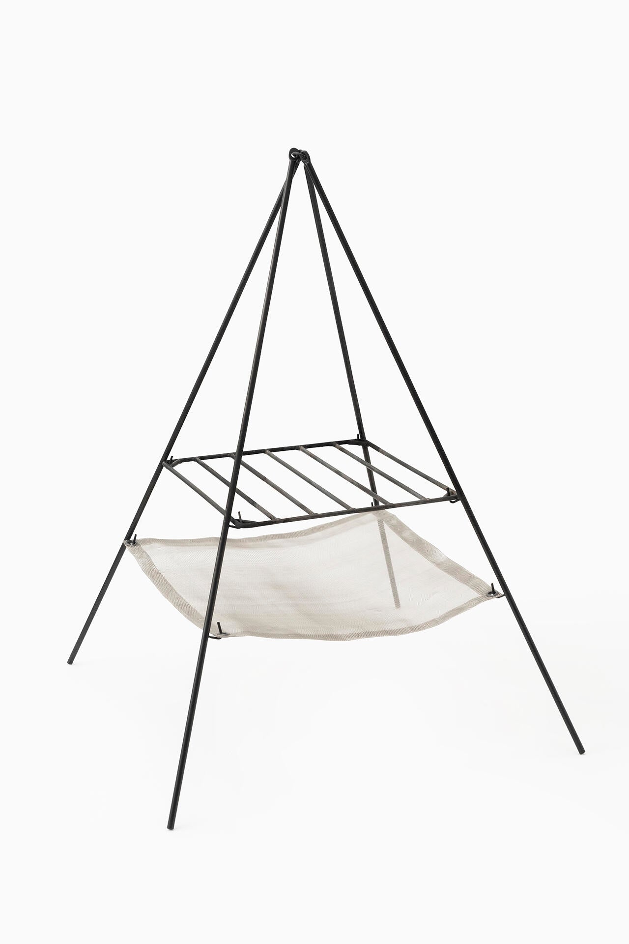 ピラミッド状の構造に焼台、ステンレスのファイヤーメッシュを取り付けて使用する焚火台です。