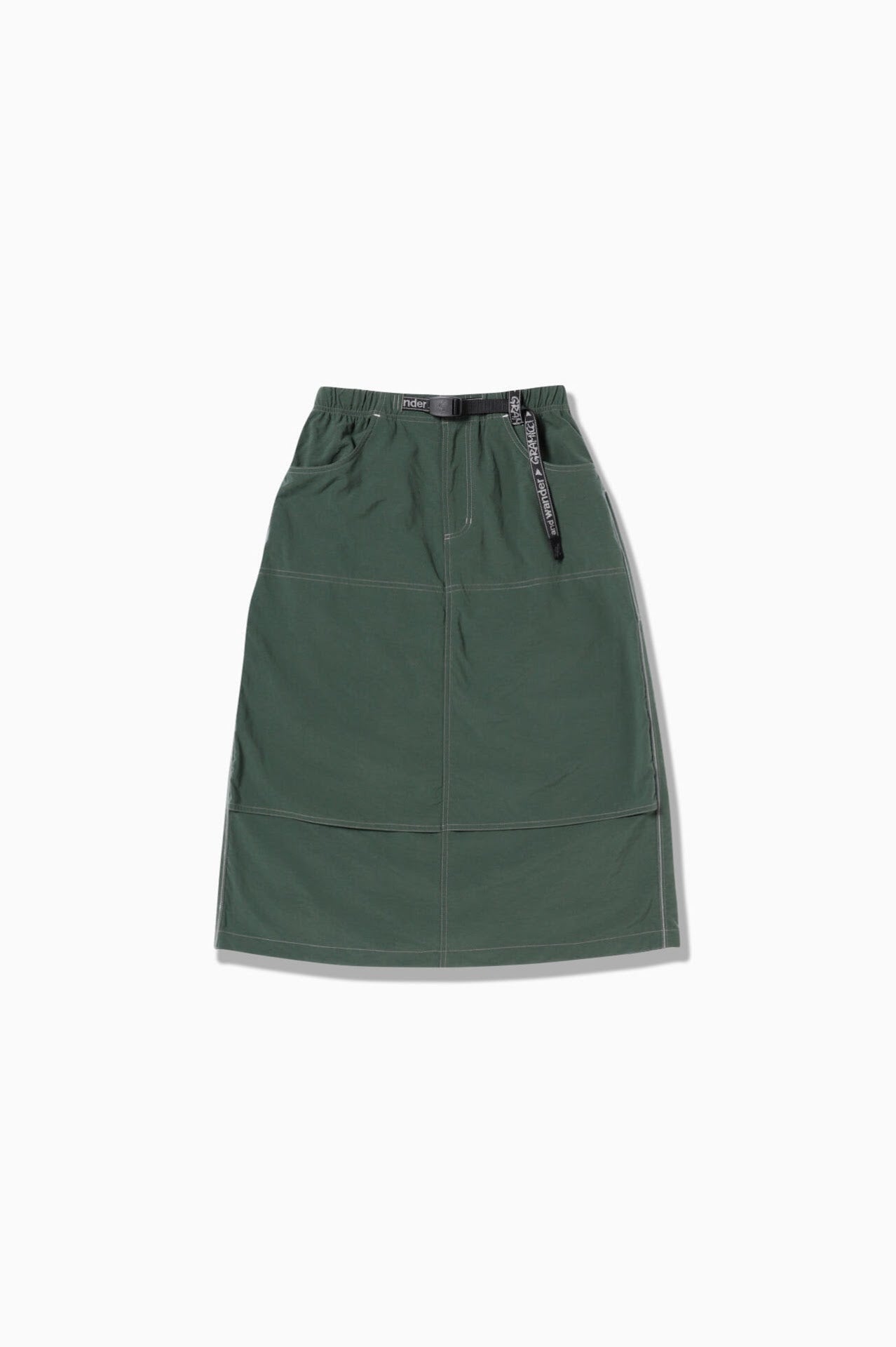 Gramicciの定番型である、DOUBLE KNEE PANTのディティールを落とし込んだスカートです。タスラン糸を使用したオックス素材は、撥水加工(C0)を施しています。部分的にリフレクターステッチを使用して夜間での視認性があります。
