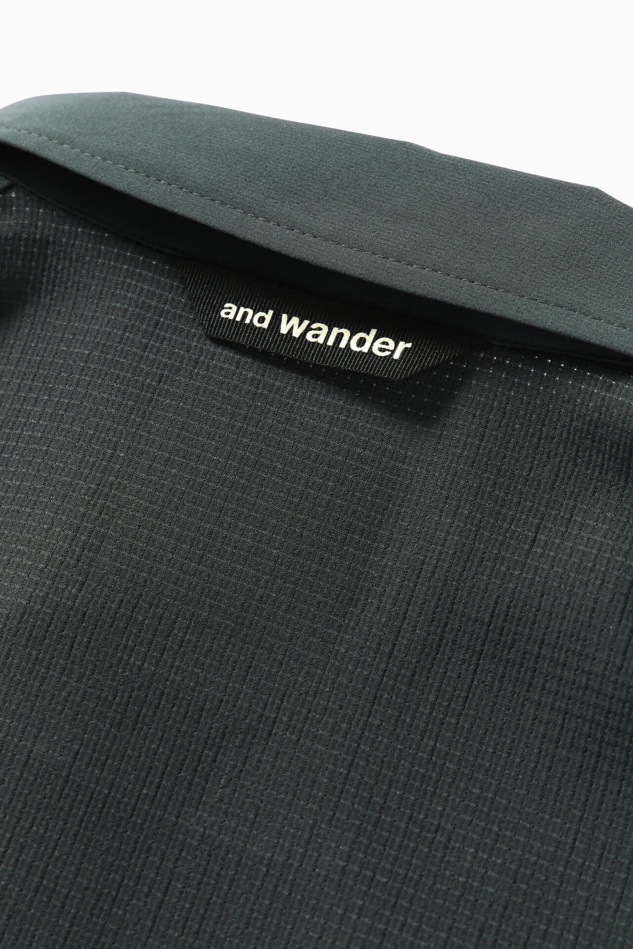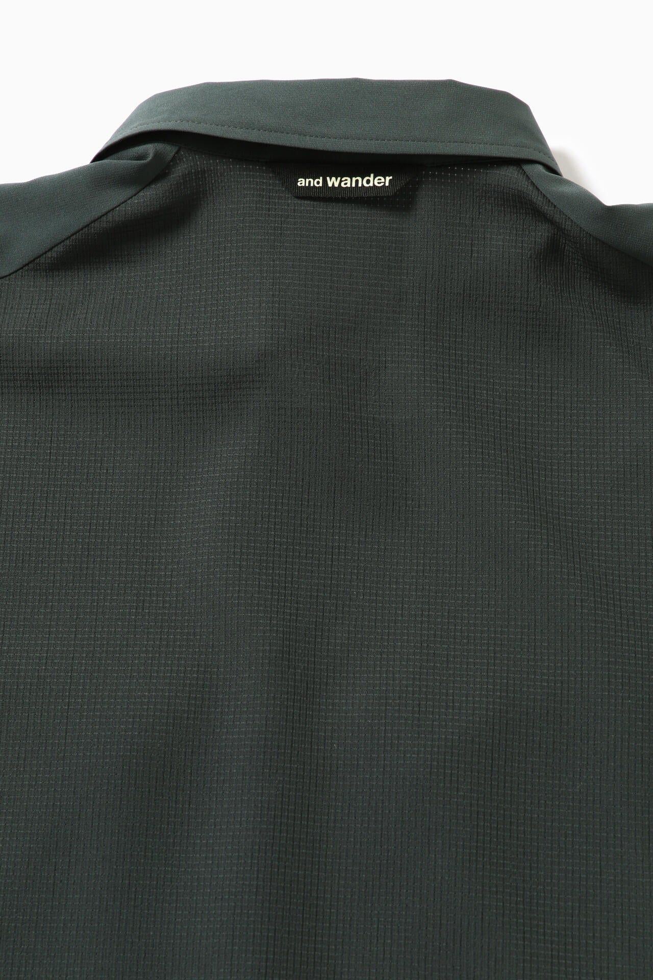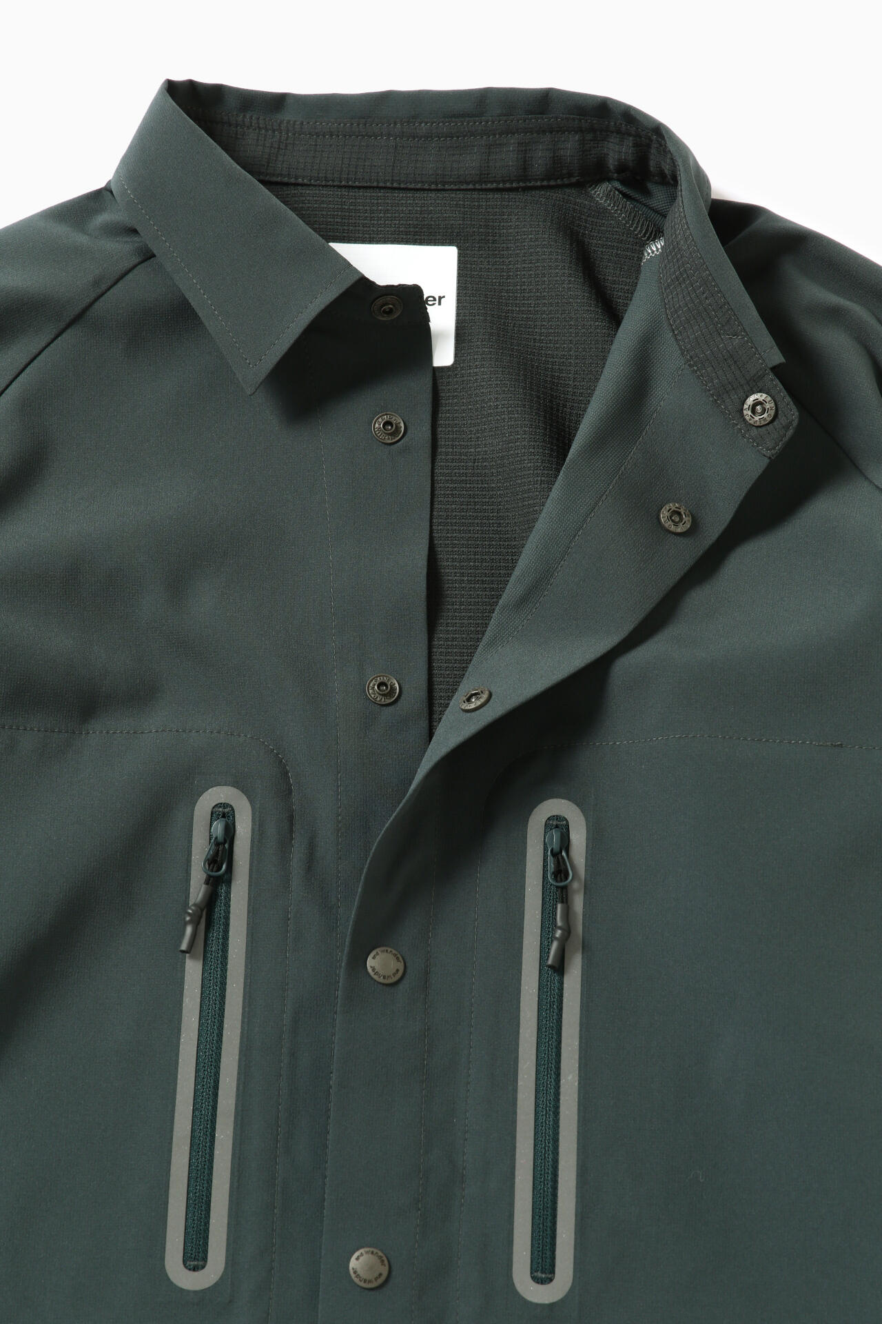 ストレッチ性とUVカット性を兼ね備えたマイクロファイバーを立体構造に織り上げることによってソフトな風合いと肌面に凹凸を形成させています。背中には、メッシュを配して、ムレや冷えかえり感を少なくしています。脇下は汗の臭いを抑えるデオドラントステッチを使用しています。ポケットのファスナー口は再帰反射シートの圧着仕様です。