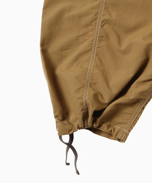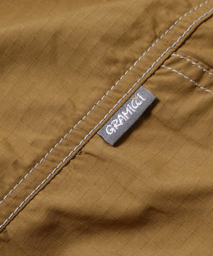 Based on Gramicci's classic VOYAGER PANT. RIPSTOP fabric using 320D threads in both warp and weft is treated with a water-repellent finish. Partial reflector stitching provides nighttime visibility.
