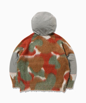 This 5G double jacquard is knitted in an original camouflage pattern using a blend of acrylic nylon wool and mohair yarns. Both sides are brushed for a nice texture. This is a hybrid hoodie that combines the characteristics of knit manufacturing with those of woven fabric sewing. The partially used nylon fabric is an eco-friend