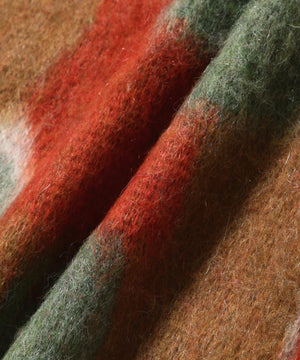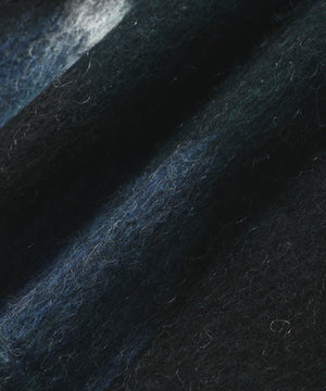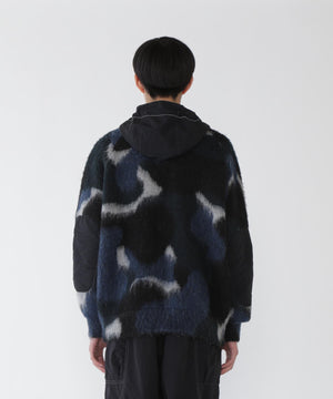 5Gのダブルジャガードで、アクリル、ナイロン、ウール、モヘヤの混紡糸を、オリジナルのカモフラ柄に編み立てています。両面起毛加工により風合いよく仕上げました。ニット製造の特性と、布帛縫製の特性を混ぜた、ハイブリッドなフーディーです。部分使いのナイロン生地は、繊維廃棄物から再生されたナイロンを50%使用した、エコ素材を使用しています。