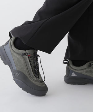 ROAとand wanderのコラボレーション。アントローナ渓谷のアイベックスからインスパイアされたハイブリッド・ハイキング・スニーカー。 この軽量デザインは、トラクションを損なうことなく運動性を向上させるため無駄のないプロフィールが特徴。 ストーンウォッシュ加工のアッパーは上質なリアルスエード製。プラーコードを備えたレーシングシステムを改良し、クライミングシューズの構造を彷彿とさせるブランドロゴ入りのウェビングをタンとバックカウンターにあしらった。 防水メンブレンのナイロンライニング。 Vibram(Registered Trademark)Xs Trekの歯付きトレッドパターンのソールは、荒れた路面でも最適なトラクションを発揮。