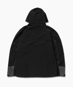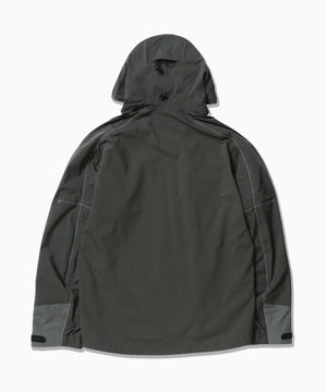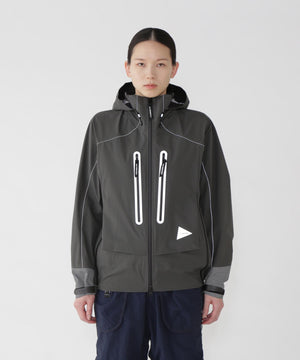 PERTEX SHIELDを使用しています。40デニールナイロンに20ミクロンの無孔膜ポリウレタンフィルムと20デニールナイロントリコットをラミネートした3レイヤーの耐久撥水生地です。このジャケットは優れた透湿性能があります。耐水圧 20000mm (JIS L 1092 Bタフタカバー法) 透湿度20000g/m2-24H(B-1法)。立体的なカッティングでアクティブなシーンに活用できます。大きなポケットが特徴です。脇下にベンチレーションがついており体温調節が楽にできます。部分的にリフレクタープリント、リフレクターステッチを施しており、夜間の視認性をあげています。