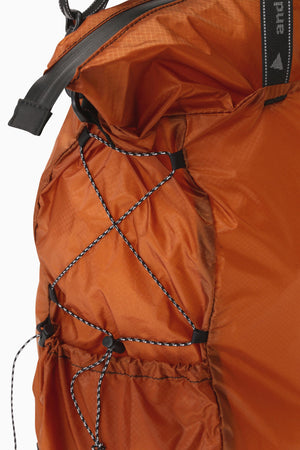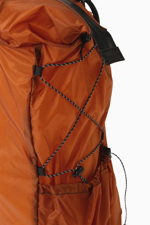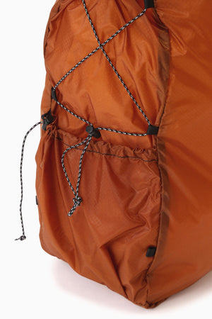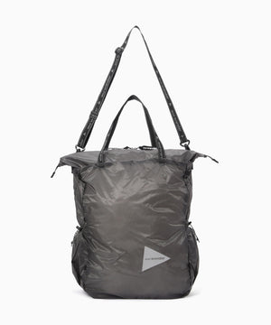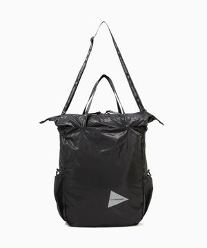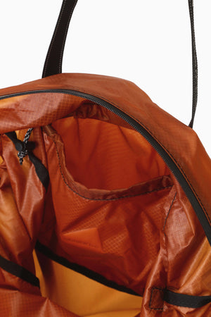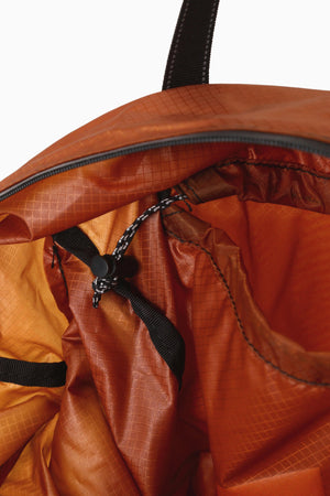 INVISTA社の30D CORDURAナイロン素材を使用しており、摩耗、引き裂き、すり切れに強く、シリコンコーティングによる優れた撥水性と1000mm以上の耐水性能をもちます。旅行などに便利なパッカブル仕様のトートバッグで、ストラップで肩掛けすることも出来ます。内側のポケットに本体を収納することができます。実測容量25L