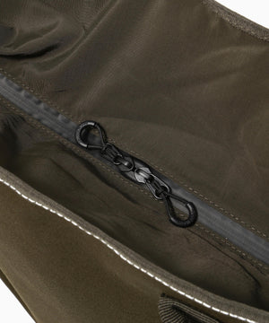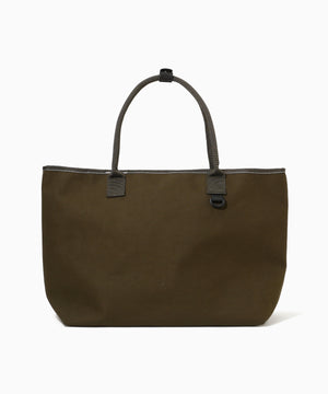 This tote bag is made of a material with polyester for the warp a blend of cotton and nylon for the weft and a TPU coating on the back. It is a hybrid material that is waterproof with a water pressure resistance of 10000 mm but has a blend of about half cotton so you can enjoy the color and texture change over time.