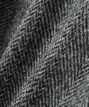 オーセンティックな英国ハリスツイードを用いた、ワイドヘリンボーン柄のジャケット。太さの異なるヘリンボーンが交互に並ぶ表情豊かな素材を、今シーズンはグレーカラーで展開。スコットランドのアウターヘブリディーズ諸島で、伝統的な製法を受け継ぐ職人の手によって織り上げられ、マーガレット・ハウエルの冬素材を語る上で欠かせない存在。