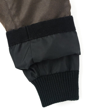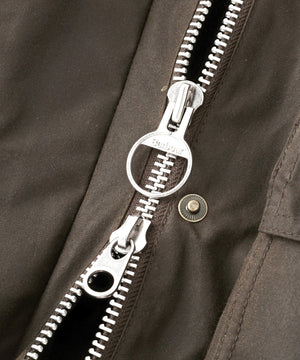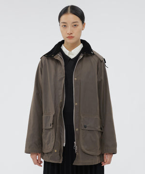 「SOLWAY ZIPPER」をベースにモダンへアップデートしたデザイン。 ゆとりのあるバストとラグランスリーブで動きやすく、カーコート丈のリラックスシルエット。ブラックのコーデュロイ襟はストームタブ付きで防寒性を高め、袖口内側にはニットリブを備え風の侵入を防ぐ仕様。前開きはダブルジップにストームフラップを重ね、マチ付きフラップポケットや内ポケットまでスタッズボタンで統一。取り外し可能なワイヤー入りフードも備えた実用的な一着。