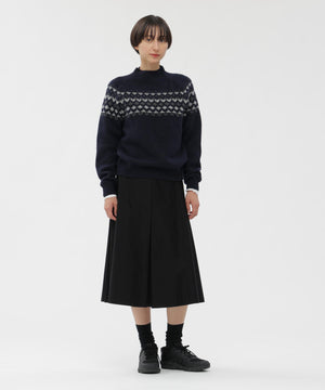ハリを活かしたAラインシルエットで、フロントとサイドに入れたボックスタックがフォルムを際立たせる存在感のある一枚。