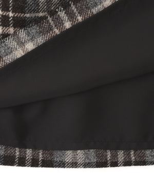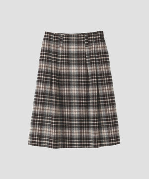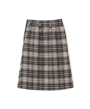 ブラウンのグラデーションで表現された大柄チェックが印象的で、上端をくしゅっと寄せたようなデザインから名付けられたペーパーバッグスカート。裾に向かって緩やかに広がるフレアシルエットが特徴。