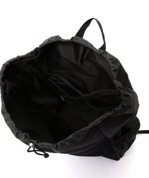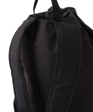 撥水性と軽さを備えたナイロンキャンバス素材を使用。約27リットルの容量があり、メインスペースにはPC対応の仕切り、フロントにはメッシュと小物用のポケット、両サイドにはボトルポケットを備えており、多様なシーンで活躍するポケット収納が充実。天口に巾着ディテールを取り入れた、キャラクターのあるバックパック。