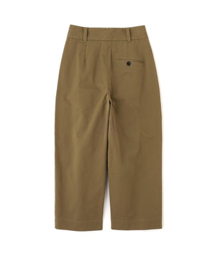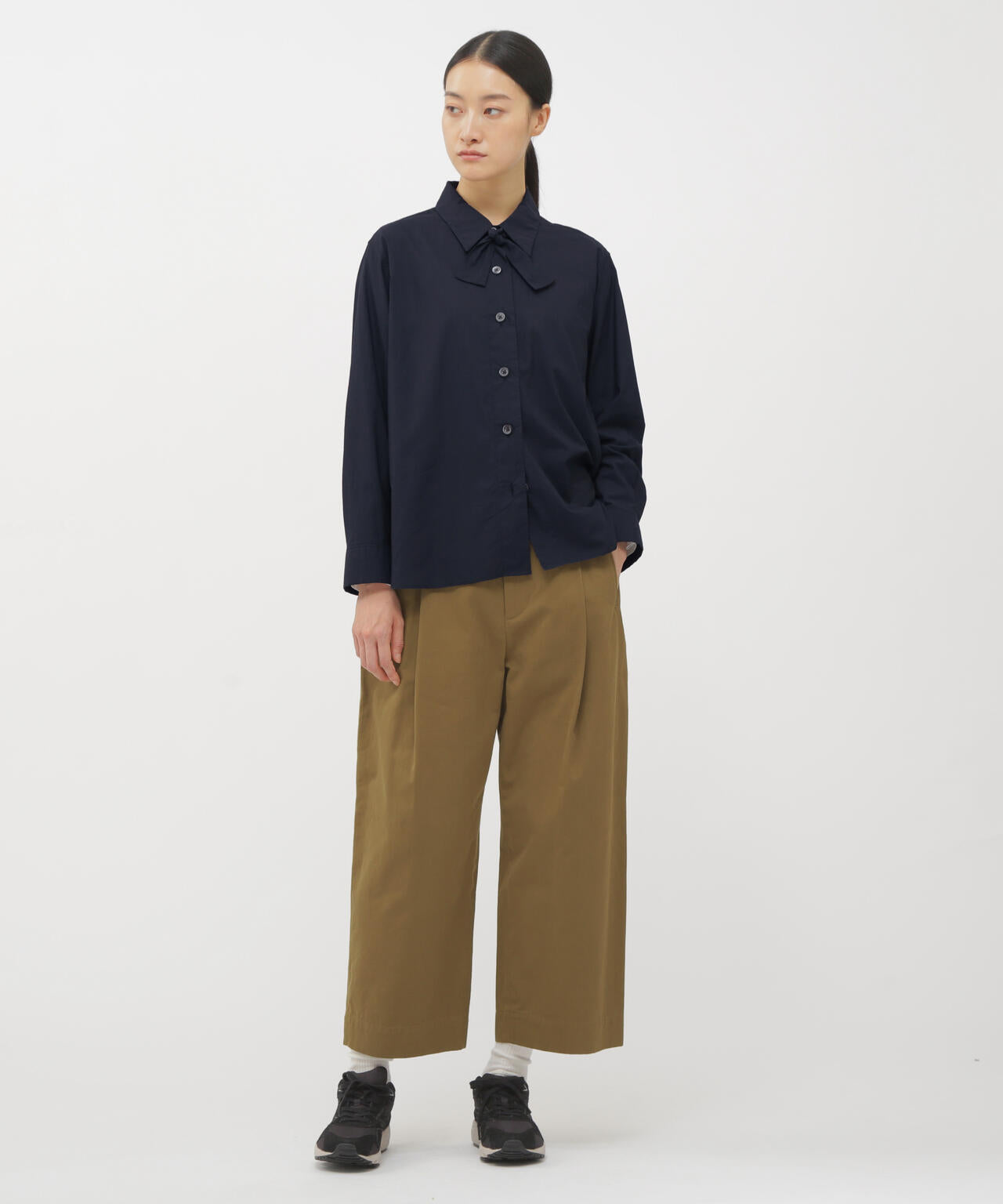 絶妙な番手ムラが生み出す、奥行きのある色合いが特長のコットンツイル素材のトラウザーズ。丁寧な晒し工程を経て染め上げることで、深みのある発色と立体感のある表情に仕上げた風合い。