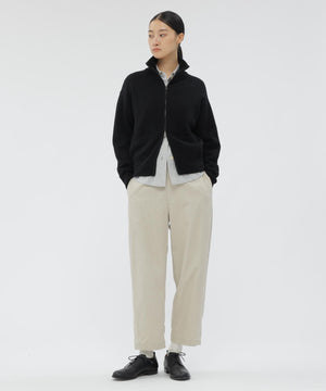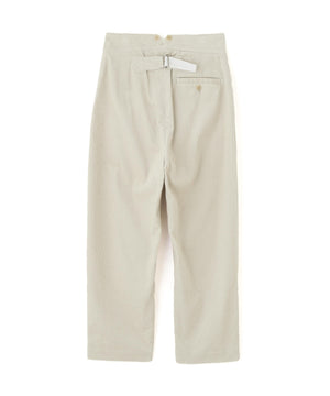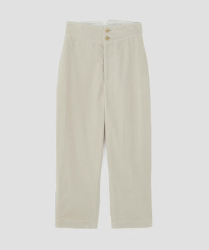 インドの超長綿スビンを使用したコーデュロイ素材のトラウザーズ。上質な糸が生む滑らかな手触りと自然な光沢が魅力。適度な落ち感と上品さを併せ持ち、柔らかな印象に仕上げた一本。