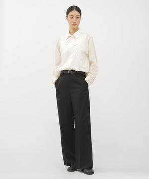 レギュラーカットのボディに、ワイドなステッチスルーの前立てと縦長のバックパネルを組み合わせたデザイン。同素材の取り外し可能なネクタイ付きで、ややクラシカルな印象を添える一枚。