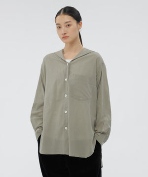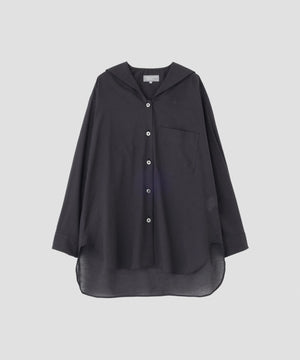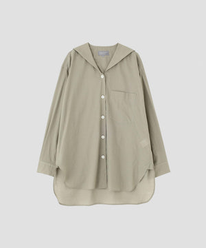 フランスのセーラー制服をリファレンスにした襟がポイントのロングシャツは、甘さを感じるデザインながら、シックなカラーにまとめることで落ち着いた雰囲気に仕上げた一着。