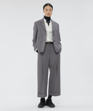 ビブフロントのディテールを取り入れたカラーレスデザインで、切り替え位置をやや低めにして、ほどよくリラックスした印象に仕上げた一着。