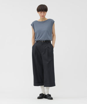 リネンとインド綿を撚糸した、清涼感となめらかさを兼ね備えた14ゲージのニットベスト。通気性のあるリネンと、やわらかなインド綿の質感を活かした盛夏向け素材。