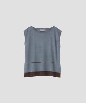 ヴィンテージニットをベースにしたノースリーブジャンパーは、裾と身頃に入れたラインが特徴。