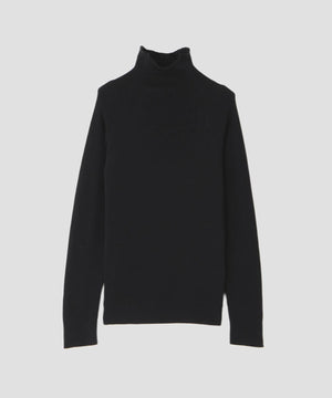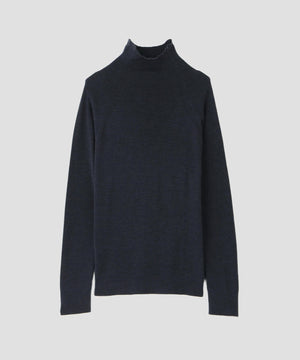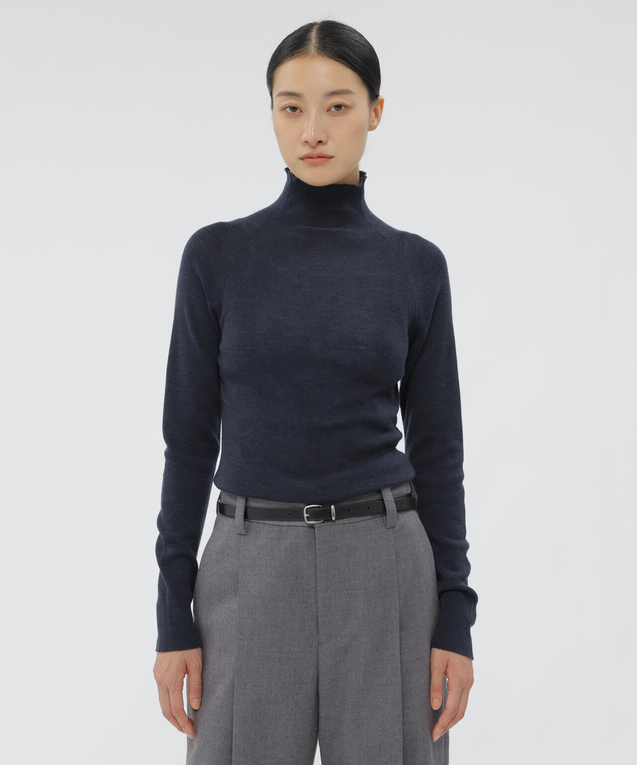 アーカイブのジャンパーをベースにしたモデルで、一体型のハイネックとラグランスリーブがポイント。ネック・袖口・裾はリブやトリムを付けず、カットオフエッジで仕上げたミニマルなデザイン。すっきりとしたフィット感で、18ゲージの薄く軽やかな編み立てにより、一枚着としてもシャツやドレスのインナーとしても活躍するアイテム。
