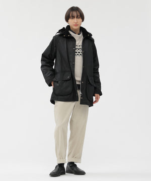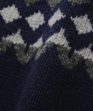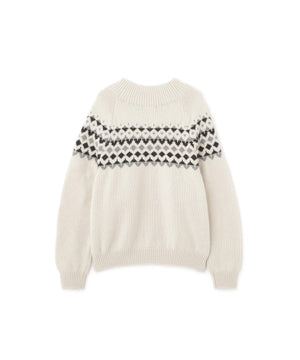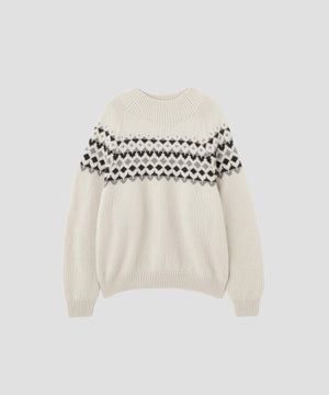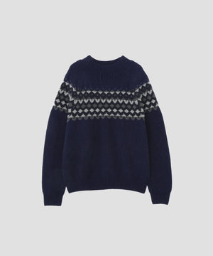 伝統的なフェアアイル柄をモダンにアレンジし、高めのハイネックとインセットスリーブ、袖口と裾の幅広リブを組み合わせたデザイン。
