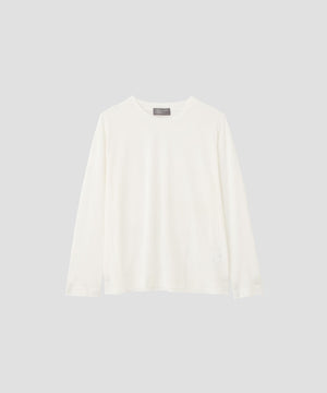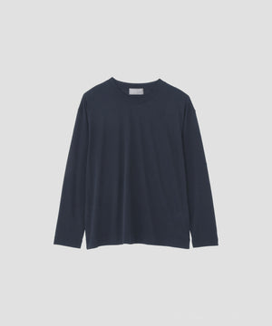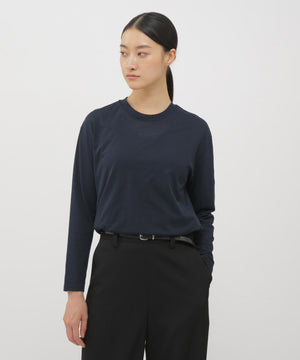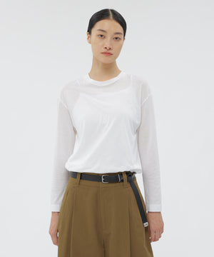 コットン100%のシャリ感と透け感をあわせ持つジャージー素材のロングスリーブTシャツ。軽やかなドレープが生まれる柔らかな風合いと、シアーな表情が特長。