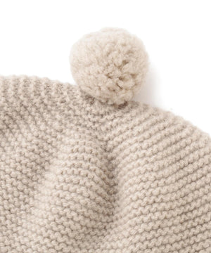 ガーター編みですっきりと仕立て、小さめのポンポンを共糸であしらったデザイン。シンプルな中にさりげない可愛らしさのある仕上がり。