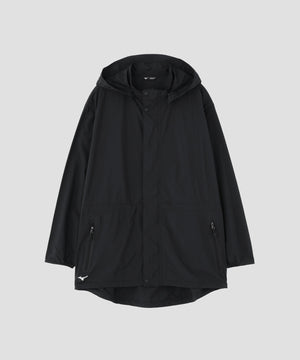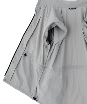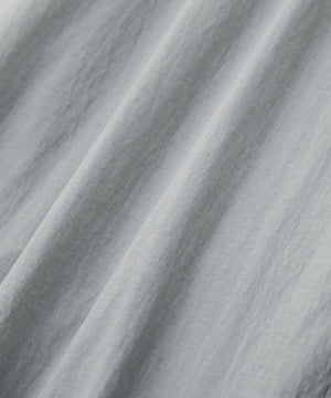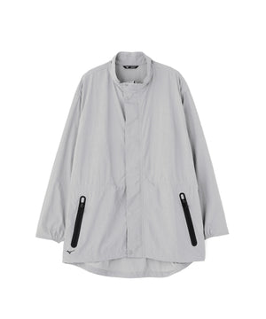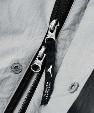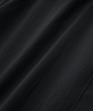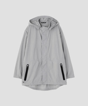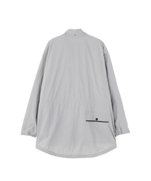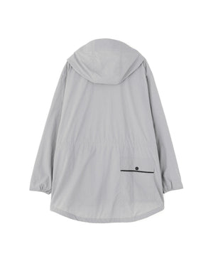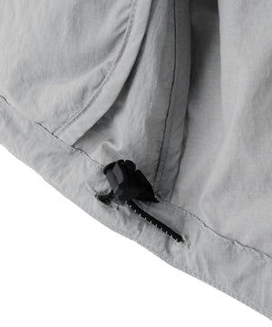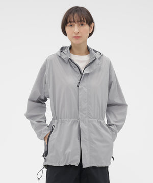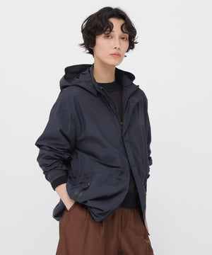 リサイクルナイロンを用いた、ナチュラルな風合いのライトウェイトポプリン素材のリラックスフィットブルゾン。ポケット周辺の圧着シートや、右寄せに配した後ろポケットが動きやすさや実用性を考慮した機能的なディティール。サイクリングジャケットをベースに、後ろ丈をわずかに長くしたバランスが特徴的。ウエストとフードに通したスピンドルで、フィット感の調整が可能。