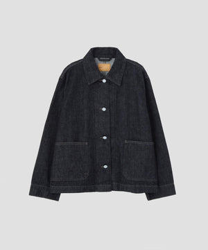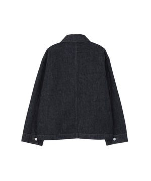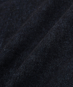 EDWIN FOR MARGARET HOWELLのデニムブルゾン。エドウインコアプロジェクトによるリサイクル糸とレギュラー糸を組み合わせた、12.5ozのオリジナルデニム素材を用いた一着。不要になったジーンズや工場の裁断くずを回収・再生し、環境負荷を抑えながらも耐久性を備えた仕上がり。