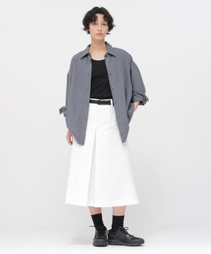 ウエストベルトと、前後と両脇にボックスプリーツを施したデザイン。動きのある表情がポイントで、ウエストまわりはプリーツを中縫いすることで、腰まわりをすっきりと見せた仕上がり。