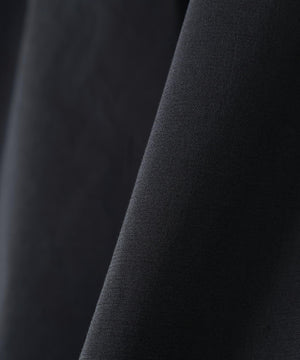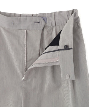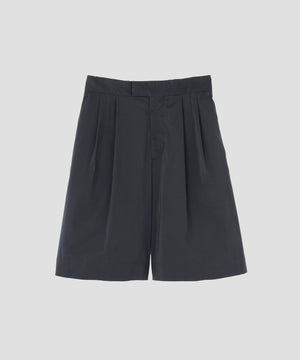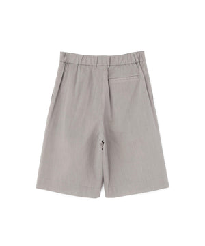 膝丈でゆとりをもたせたフォルム。フロントにダブルプリーツを入れつつ、広がりすぎない落ち着いたバランス。前はベルト仕様、後ろはゴムを配した、リラックス感のある穿き心地。同素材のジャケットとのセットアップもおすすめ。