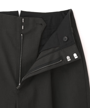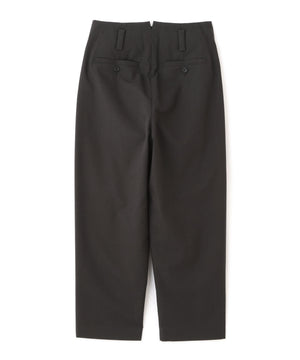 立体感のある織り組織のウール素材を用いたトラウザーズ。毛羽を抑えたきれいな糸に撚りをかけ、ドライなタッチに仕上げたウール100%素材。表面に奥行きがあり、軽やかでモダンな印象。