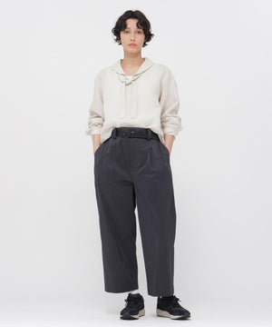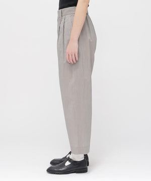 フロントにダブルプリーツを入れつつ、広がりすぎないバランスのテーパードシルエット。クロップド丈のすっきりとしたラインで、腰まわりにゆとりを持たせながら、裾にかけて自然に細くなるフォルム。同素材のジャケットとのセットアップもおすすめ。