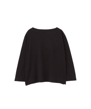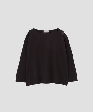 ボートネックのボクシーなバランスに、ショルダー部分のボタンがアクセントとなるデザイン。9分丈でやや広がりを持たせた袖が、さりげなく表情を加え、マリンテイストを感じさせる仕上がり。