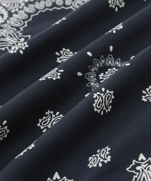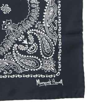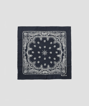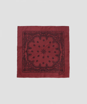 アーカイブのペイズリースカーフをもとに復刻し、四方を手まつりで丁寧に仕上げた一枚。クラシックな柄と落ち着いた色合いが、装いに上品なアクセントを添える。