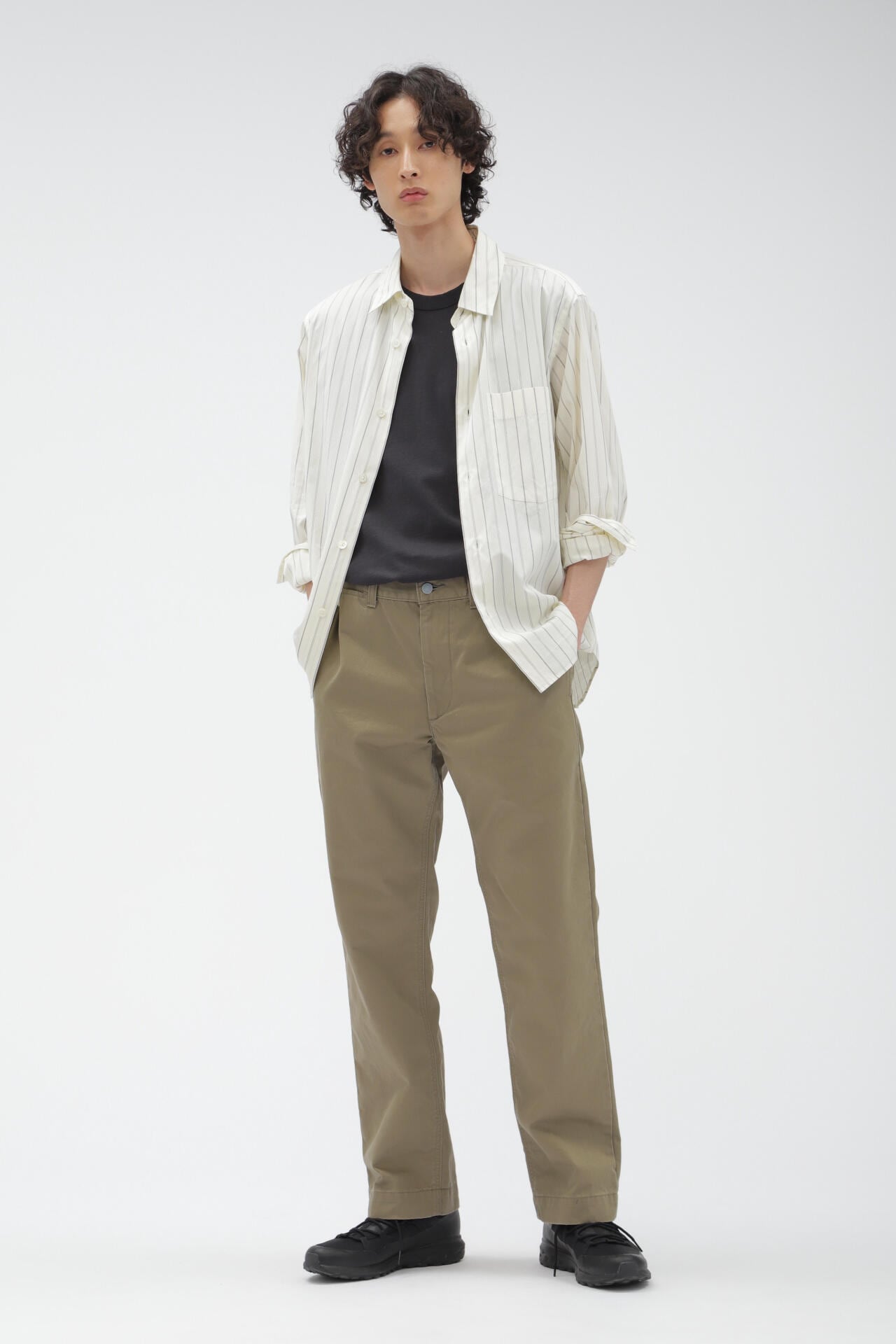 EDWIN FOR MARGARET HOWELLのコットン素材のチノトラウザーズ。製品でバイオウォッシュにかけることで生まれる軽いアタリや、馴染んだような風合いがポイント。腰回りのベルト巾やループ巾をやや太めに、腰はシンプルなシームポケットのディテールを採用。いつの時代も支持されるオーセンティックなデザインとフィットで、使い込むほどに味わいが出増すアイテム。