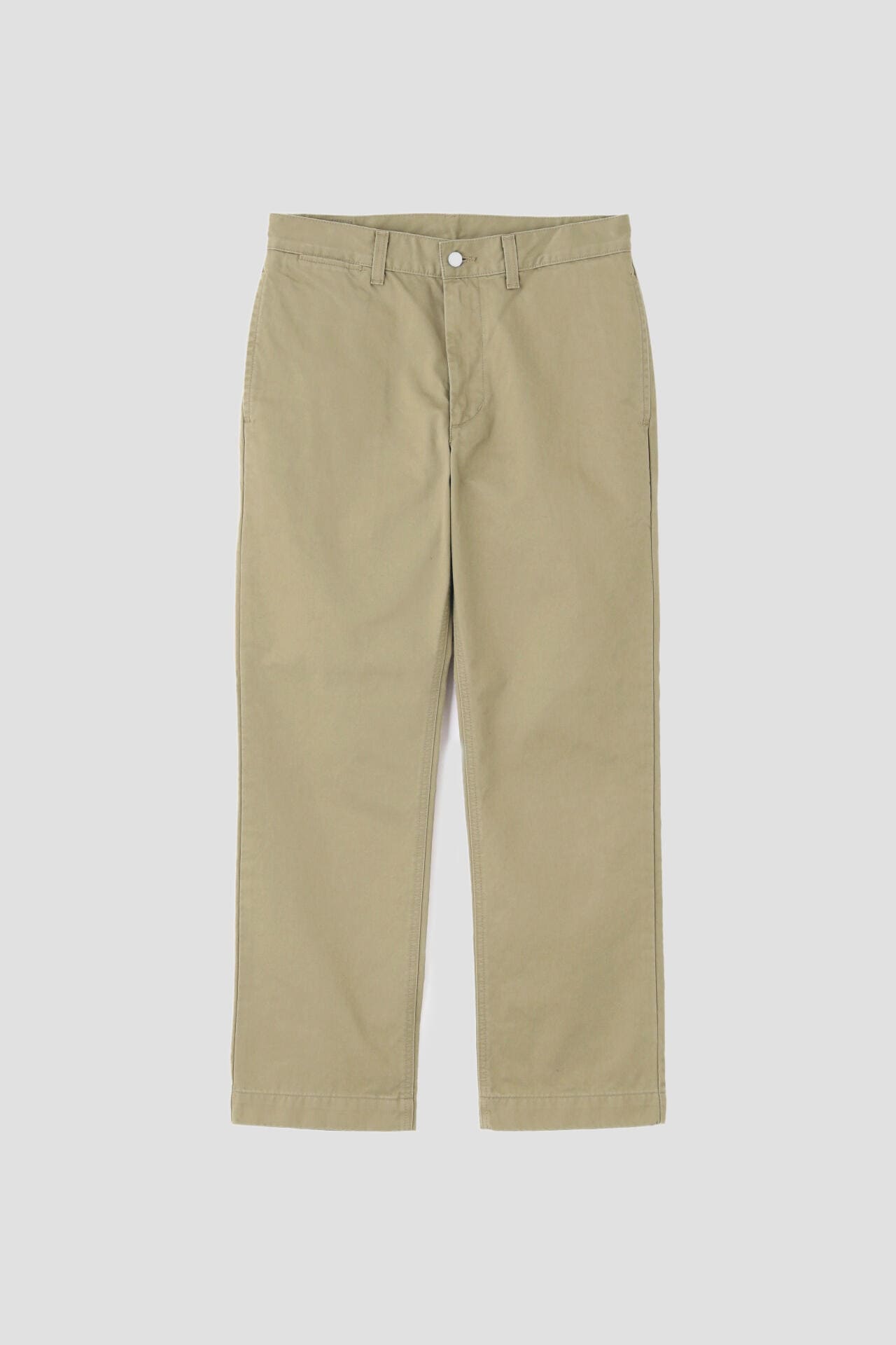 EDWIN FOR MARGARET HOWELLのコットン素材のチノトラウザーズ。製品でバイオウォッシュにかけることで生まれる軽いアタリや、馴染んだような風合いがポイント。腰回りのベルト巾やループ巾をやや太めに、腰はシンプルなシームポケットのディテールを採用。いつの時代も支持されるオーセンティックなデザインとフィットで、使い込むほどに味わいが増すアイテム。