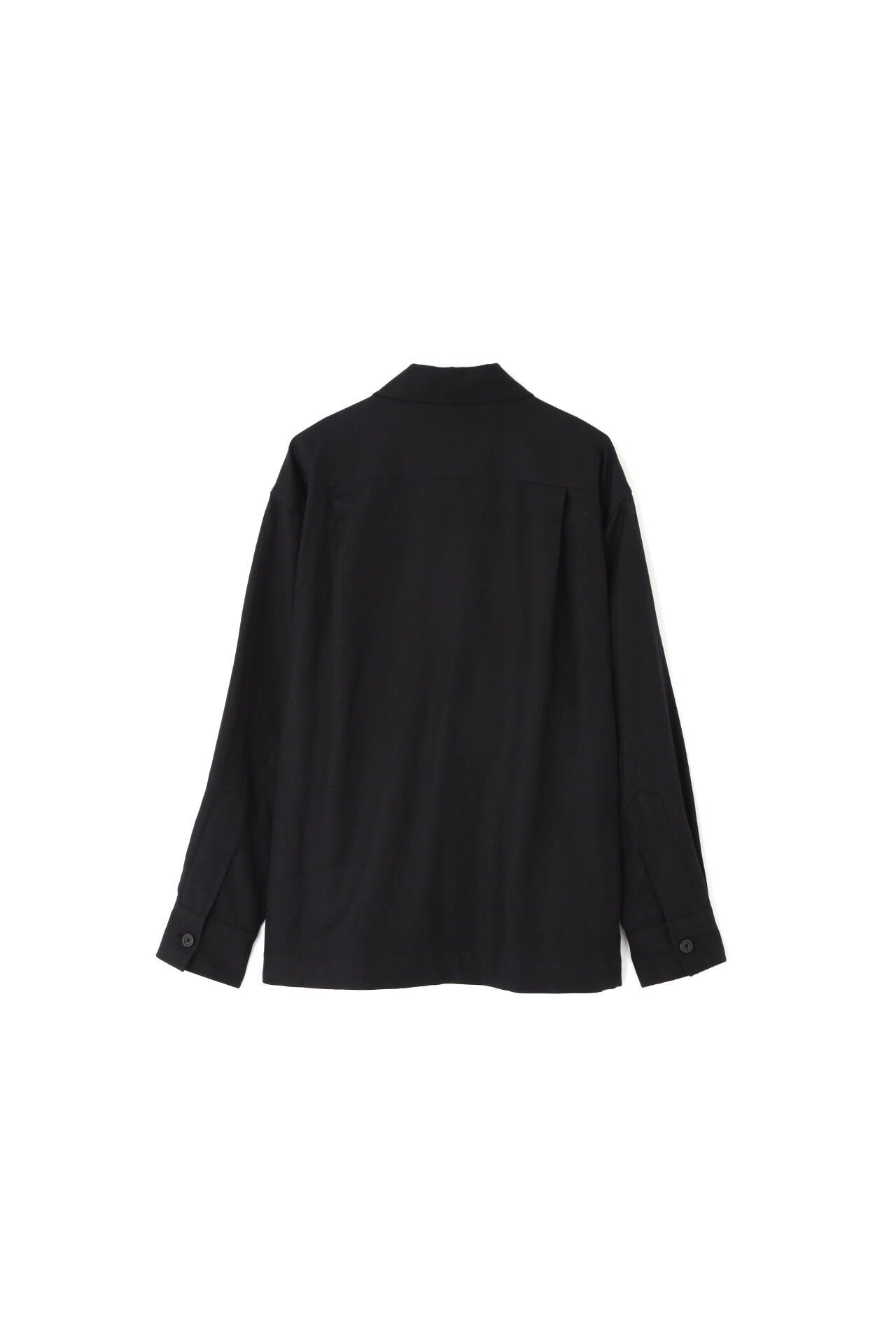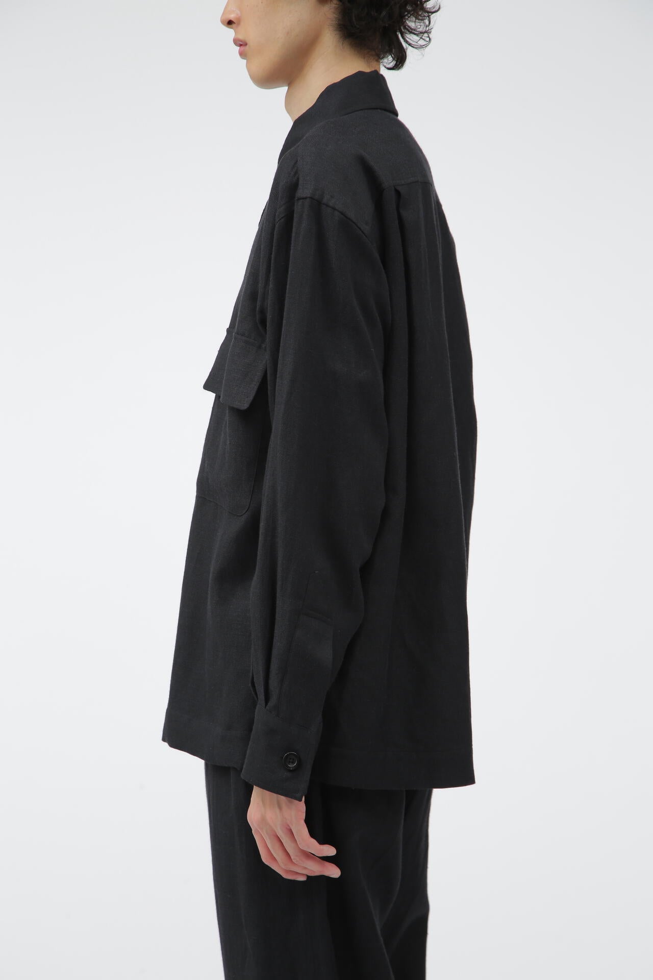 フォックスブラザーズ社製のウールリネンを使用したシャツ。上品な光沢感とリネン特有のさらっとした風合いが特徴。フラップとパッチポケットのデザインは、羽織シャツとして重宝する一着。