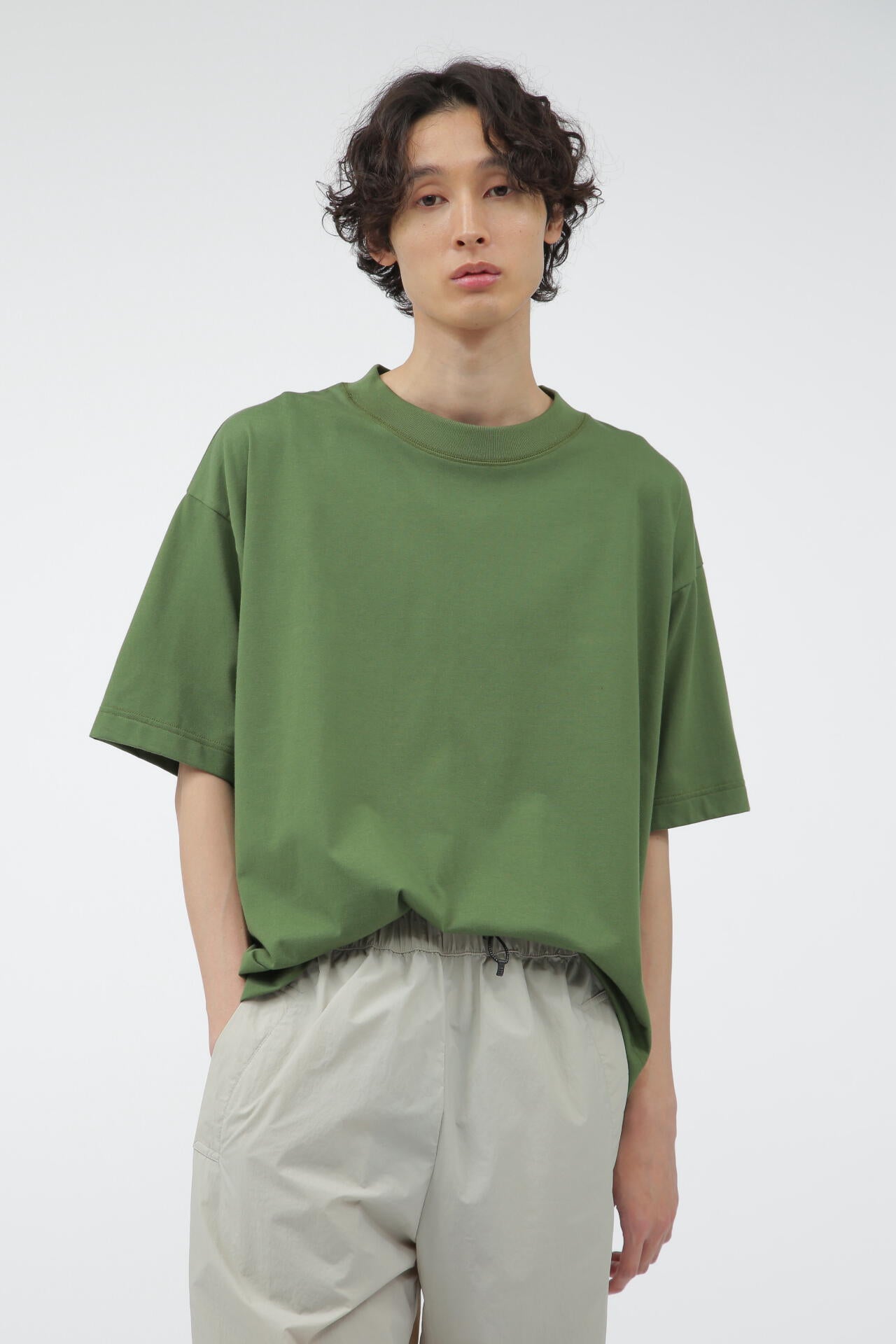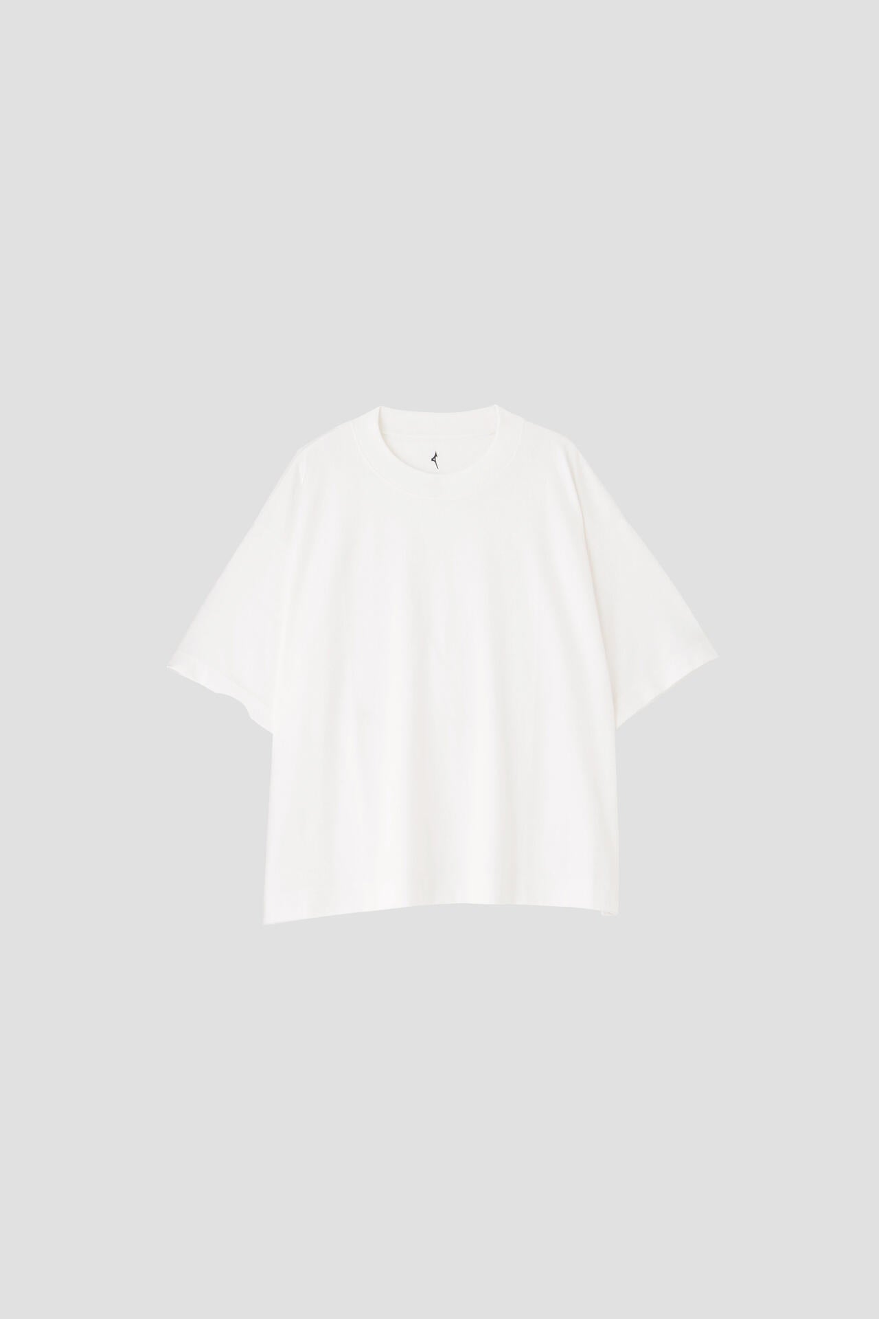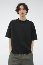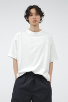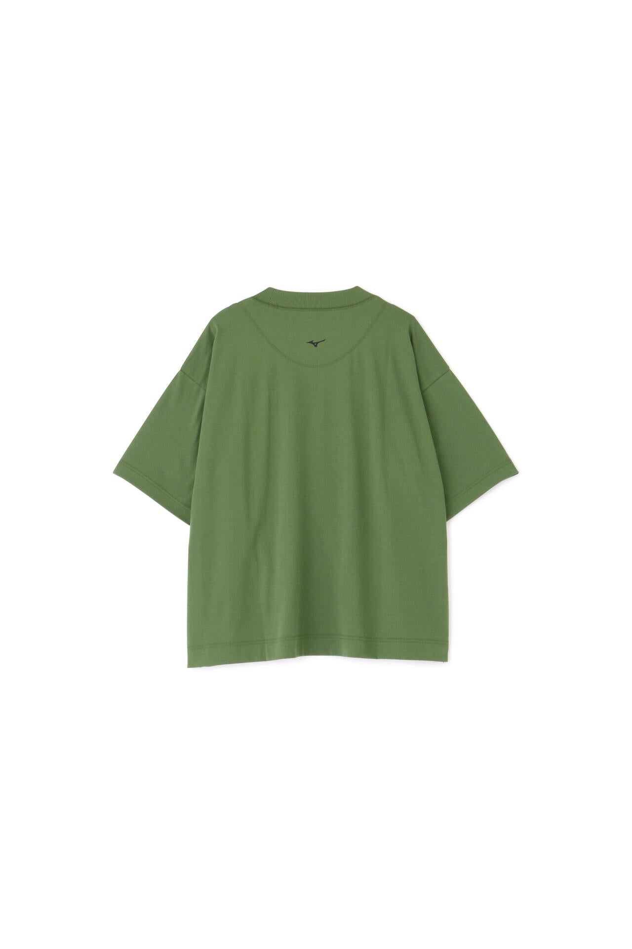 ミズノの高い技術力とマーガレット・ハウエルの感性を融合させたコレクション「MIZUNO FOR MARGARET HOWELL」。コットンとポリエステルを使用した天竺素材。コットンタッチでしっかりとした風合いや落ち感がありながらも、吸汗性と速乾性を備える。ドロップショルダーでゆったりしたワイドなシルエットに、太めのリブ襟巾がアクセントのTシャツ。