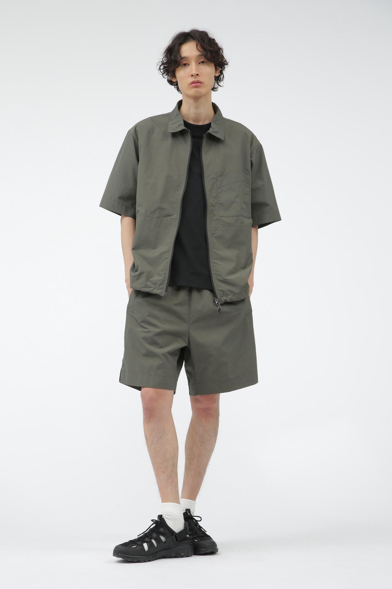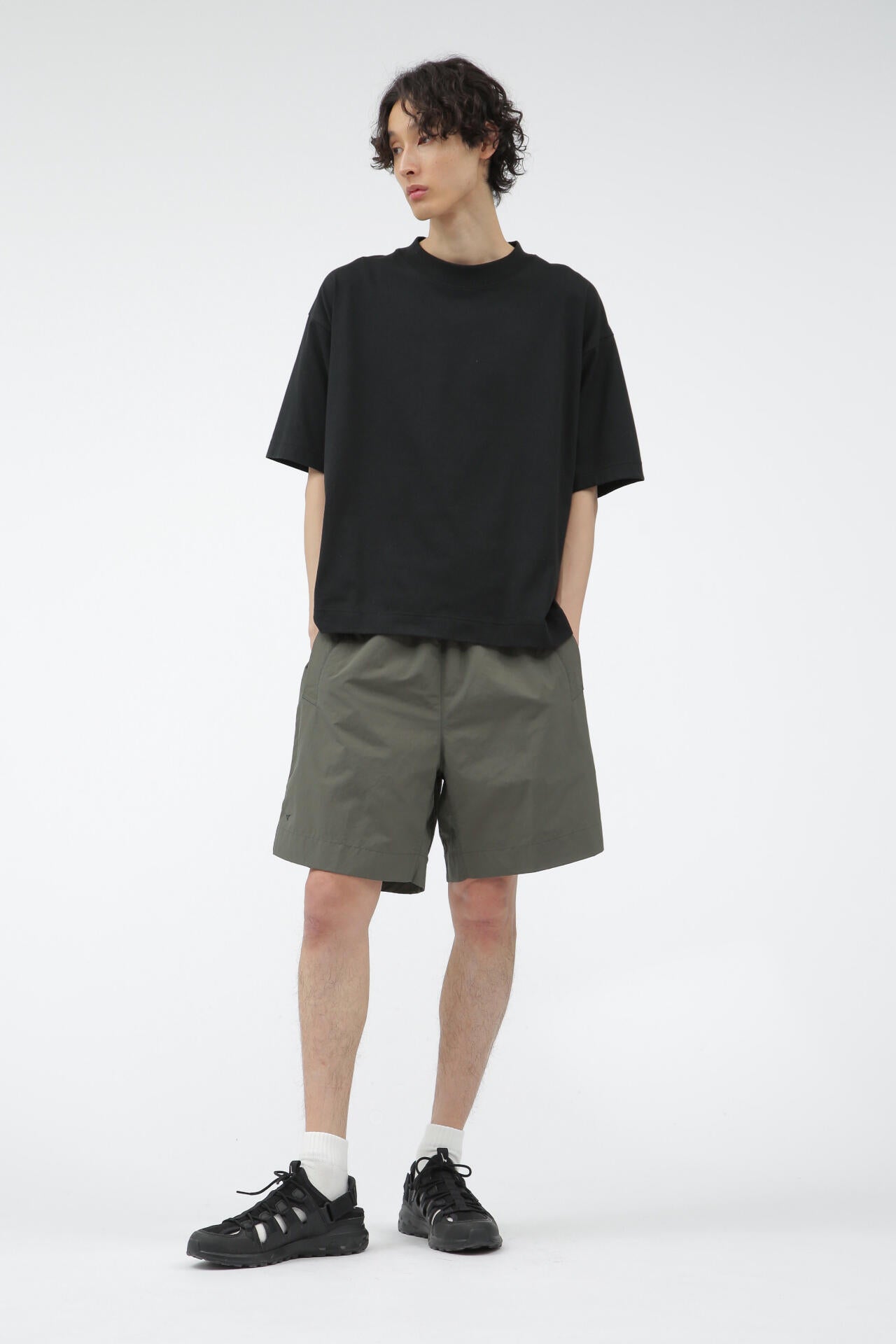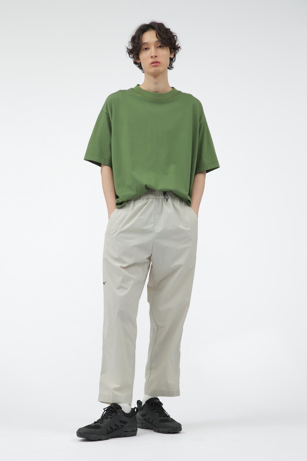 ミズノの高い技術力とマーガレット・ハウエルの感性を融合させたコレクション「MIZUNO FOR MARGARET HOWELL」。コットンとポリエステルを使用した天竺素材。コットンタッチでしっかりとした風合いや落ち感がありながらも、吸汗性と速乾性を備える。ドロップショルダーでゆったりしたワイドなシルエットに、太めのリブ襟巾がアクセントのTシャツ。