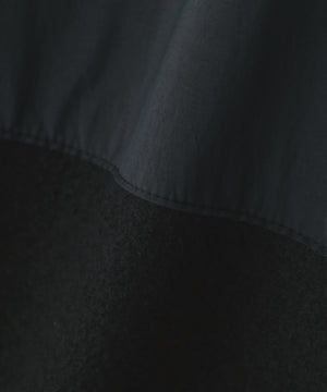 外襟とショルダーには、コットンのような風合いと耐久撥水性を備えたPFASフリーのタスランナイロンを使用。肩まわりをカバーすることで雨濡れを軽減でき、機能性と素材の切り替えを際立たせたテックジャケット。